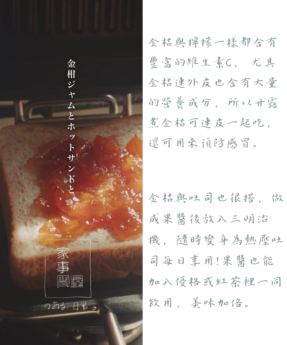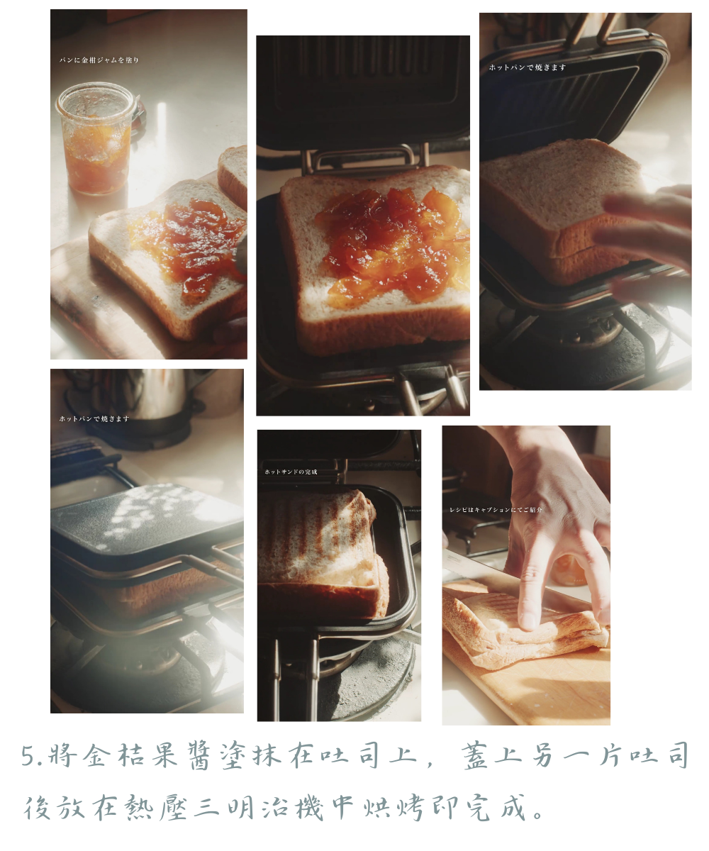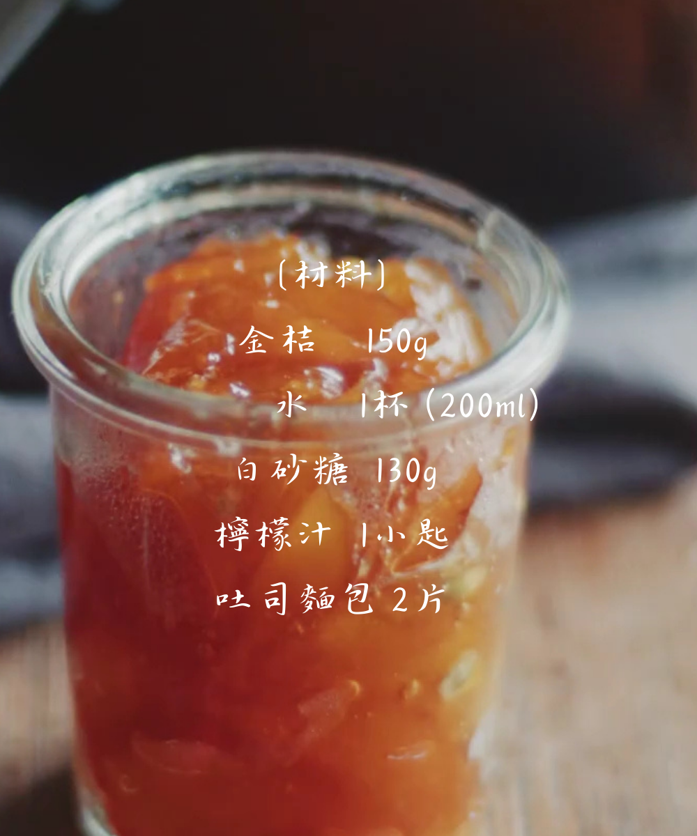 將金桔果醬塗抹在吐司上,蓋上另一片吐司後放在熱壓三明治機中烘烤即完成。