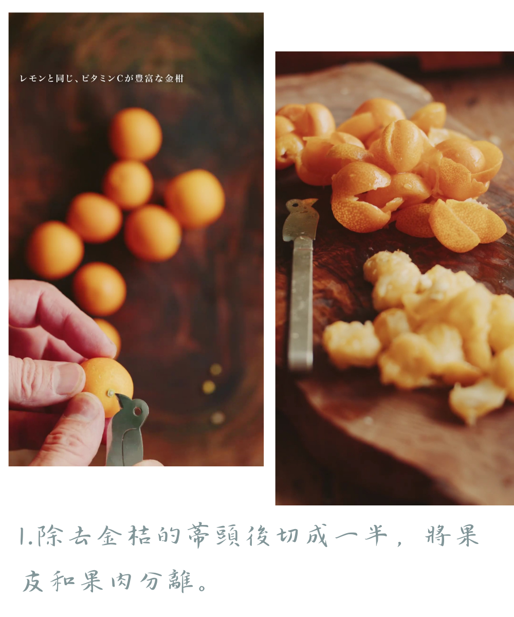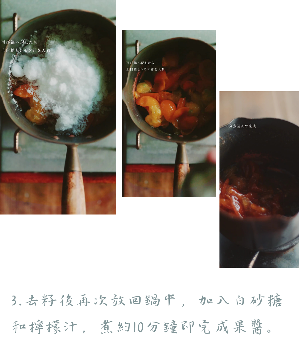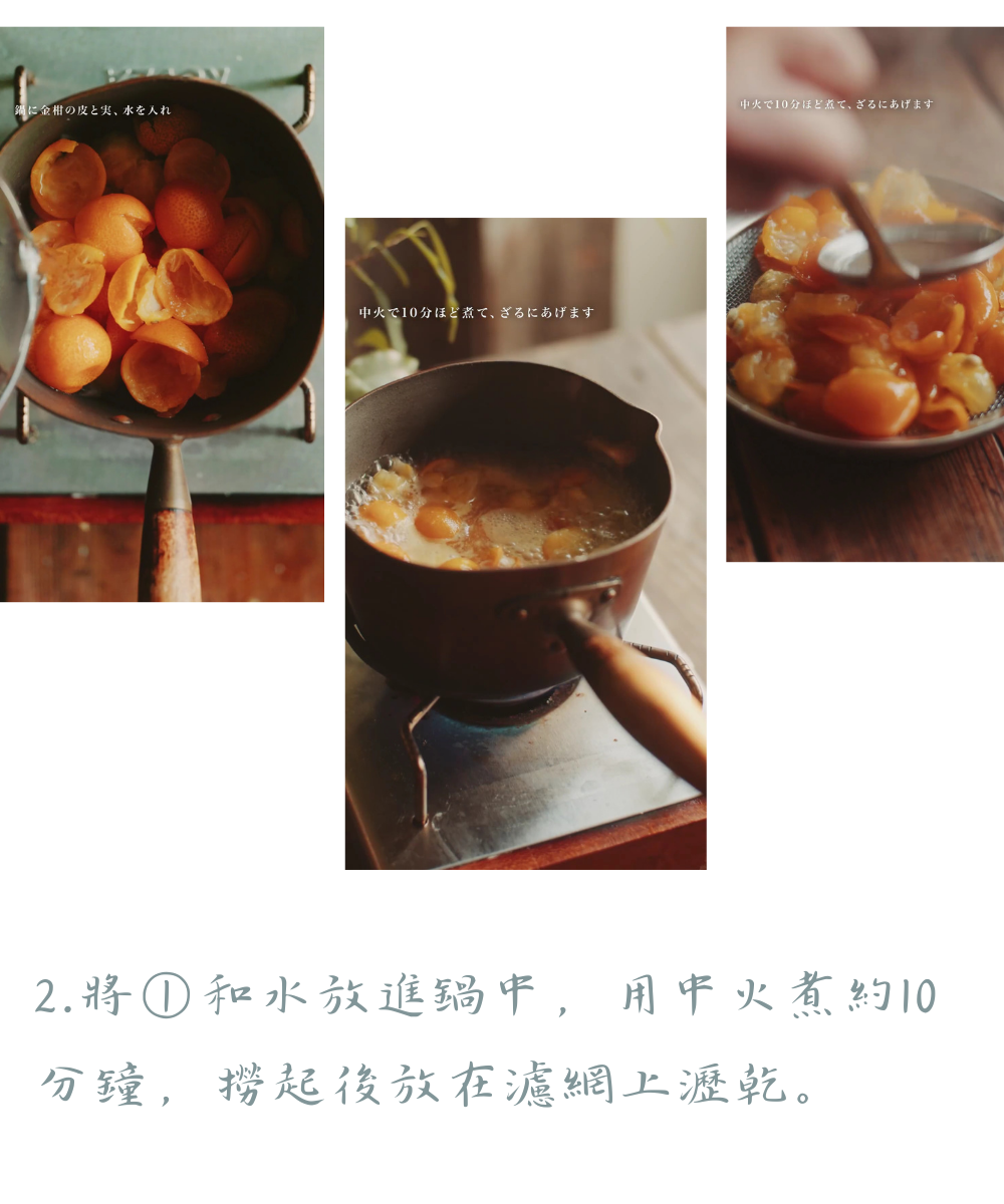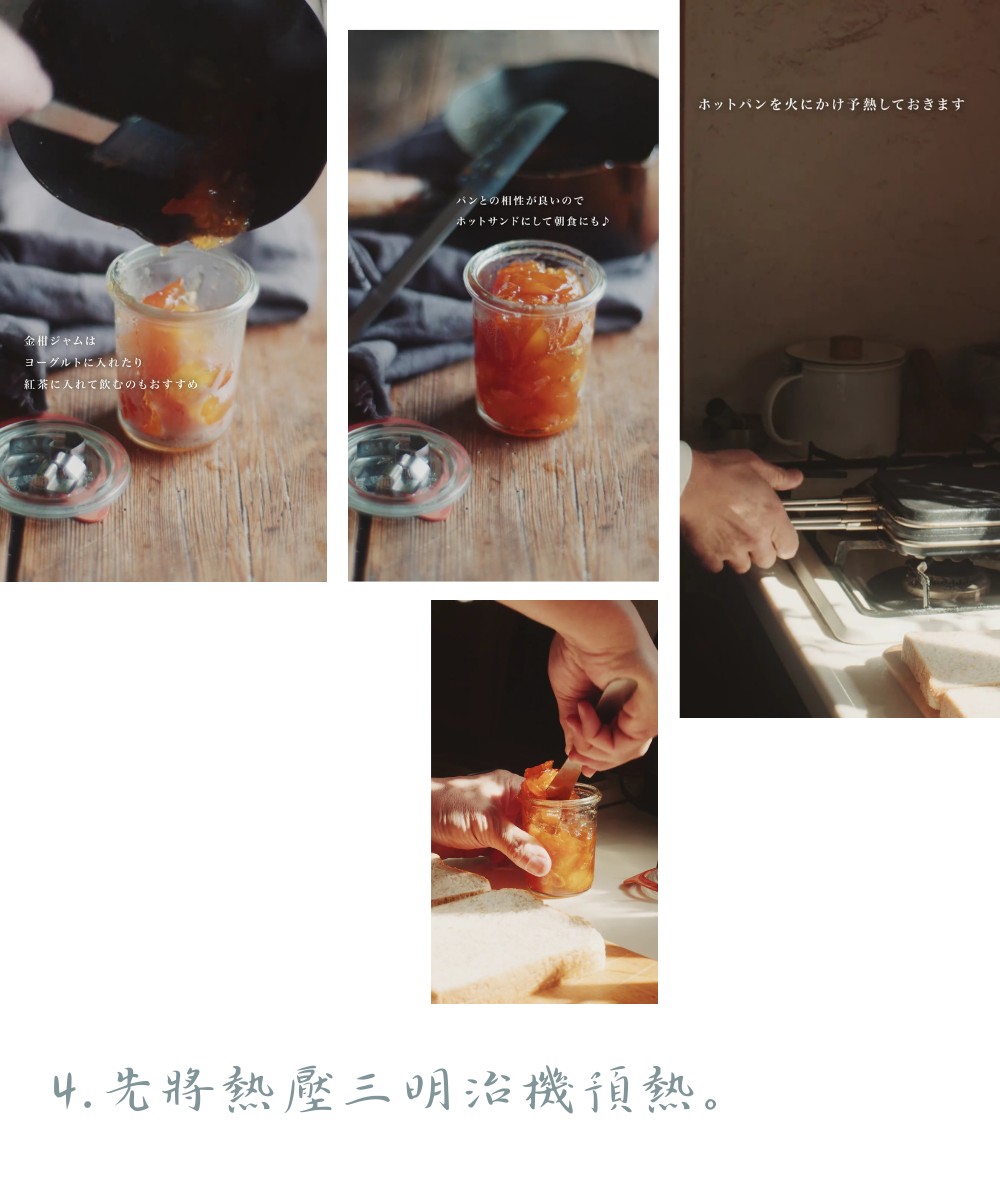將金桔果醬塗抹在吐司上,蓋上另一片吐司後放在熱壓三明治機中烘烤即完成。