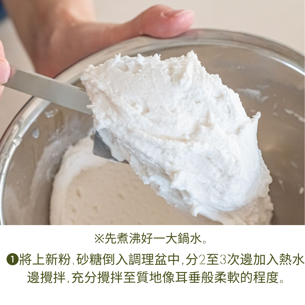 ❶ 將上新粉、砂糖倒入調理盆中,分2至3次邊加入熱水邊攪拌,充分攪拌至質地像耳垂般柔軟的程度。