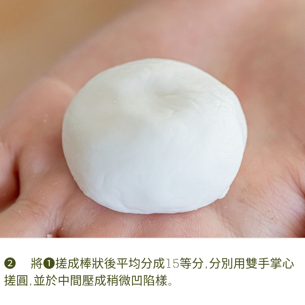 ❷ 將❶搓成棒狀後平均分成15等分,分別用雙手掌心搓圓,並於中間壓成稍微凹陷樣。