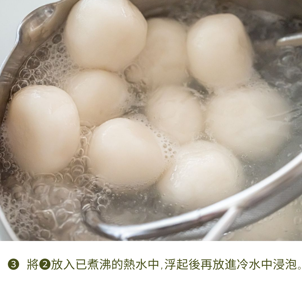 ❸ 將❷放入已煮沸的熱水中,浮起後再放進冷水中浸泡。