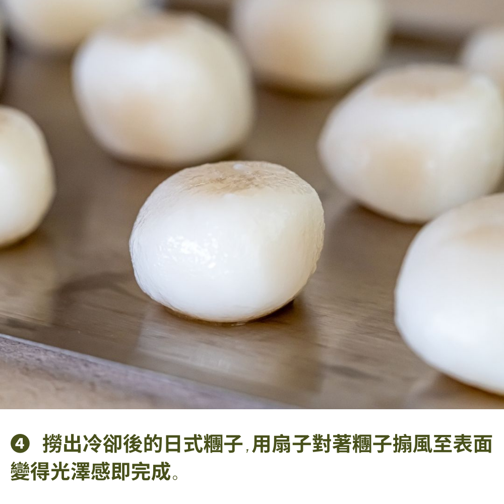 ❹ 撈出冷卻後的日式糰子,用扇子對著糰子搧風至表面變得光澤感即完成。