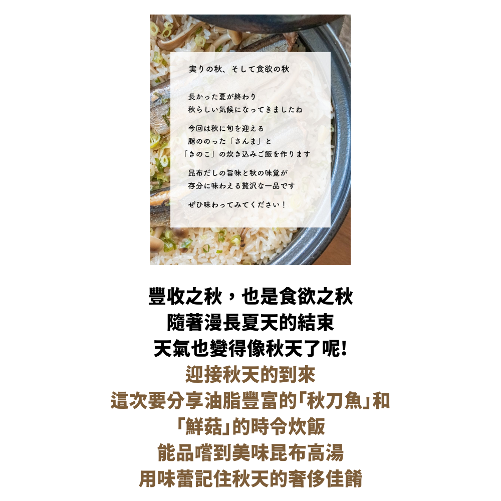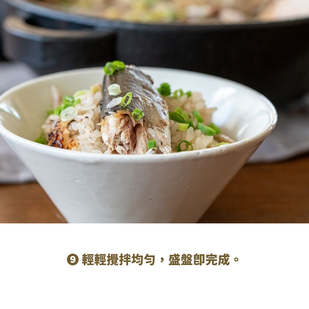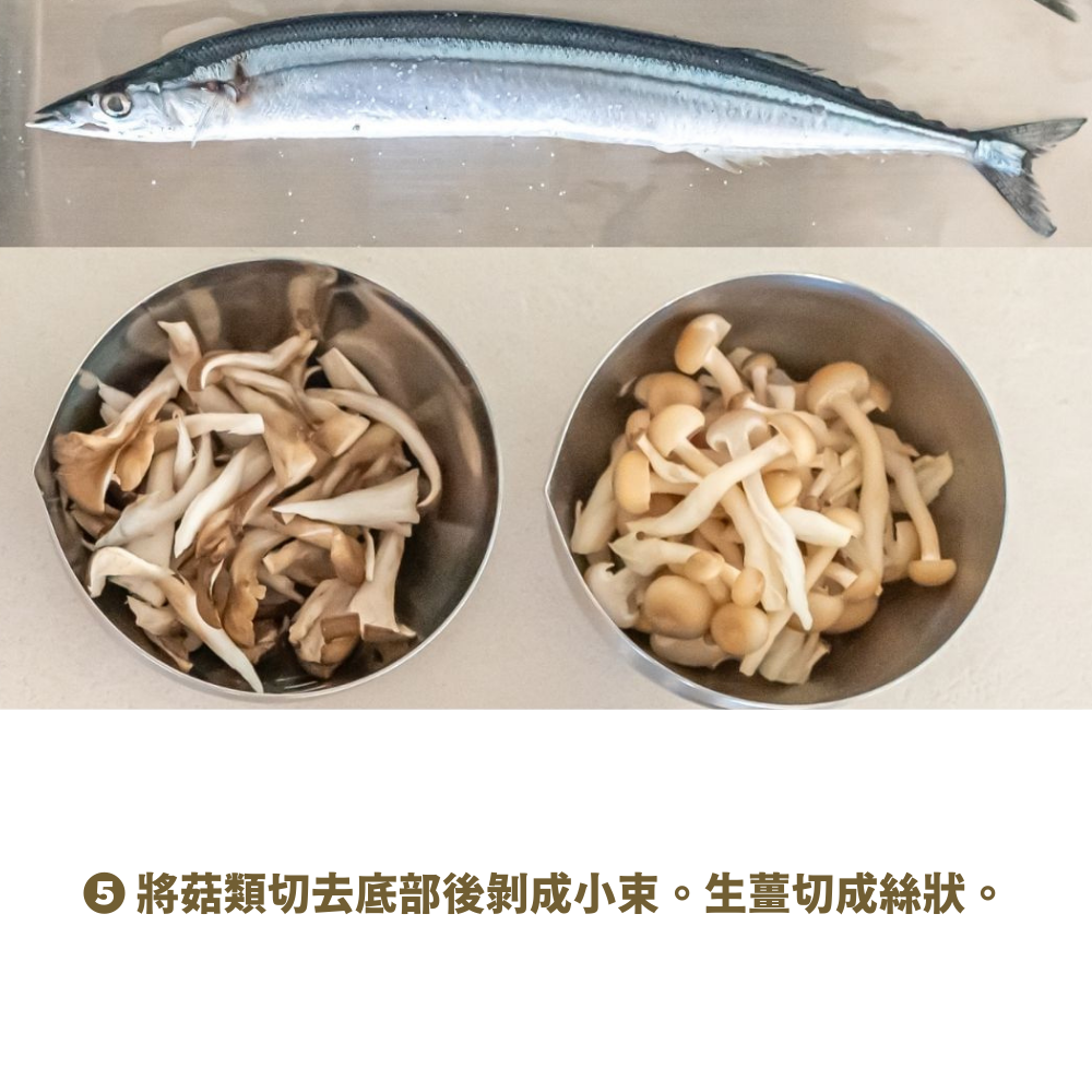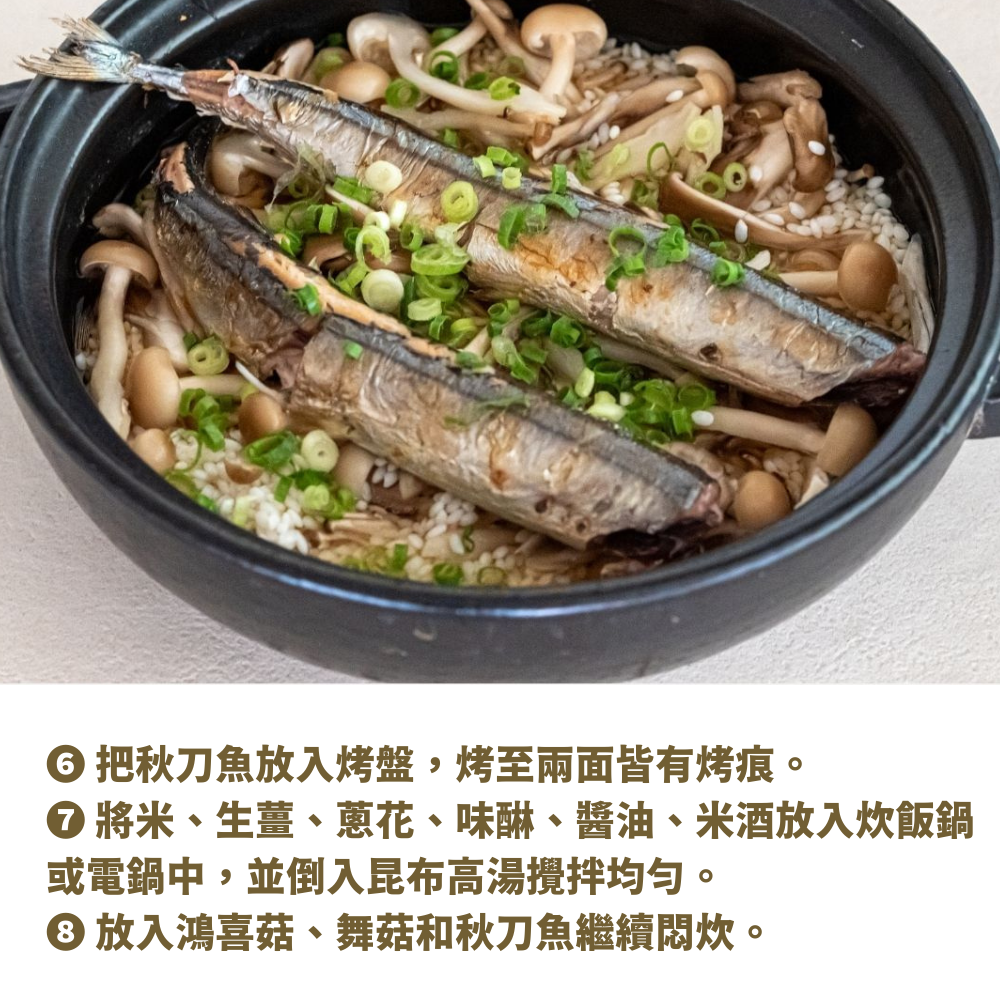 ❽ 放入鴻喜菇、舞菇和秋刀魚繼續悶炊。