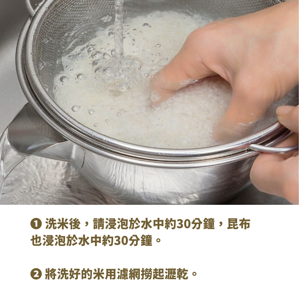 ❶ 洗米後,請浸泡於水中約30分鐘。昆布也浸泡於水中約30分鐘。