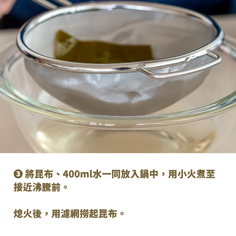 ❸ 將昆布、400ml水一同放入鍋中,用小火煮至接近沸騰前。