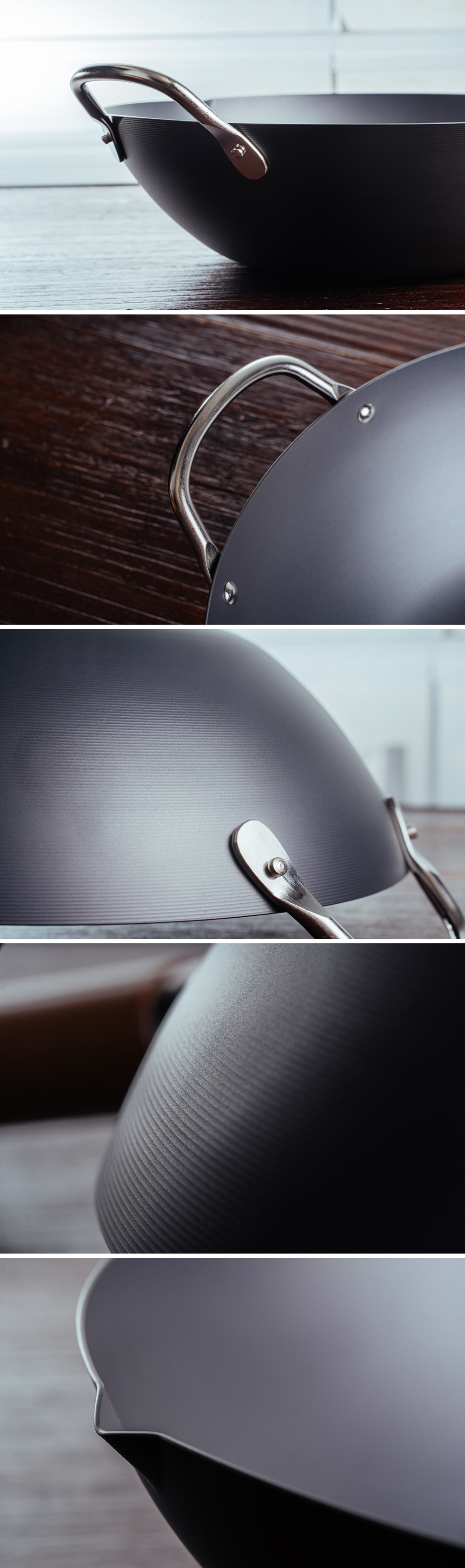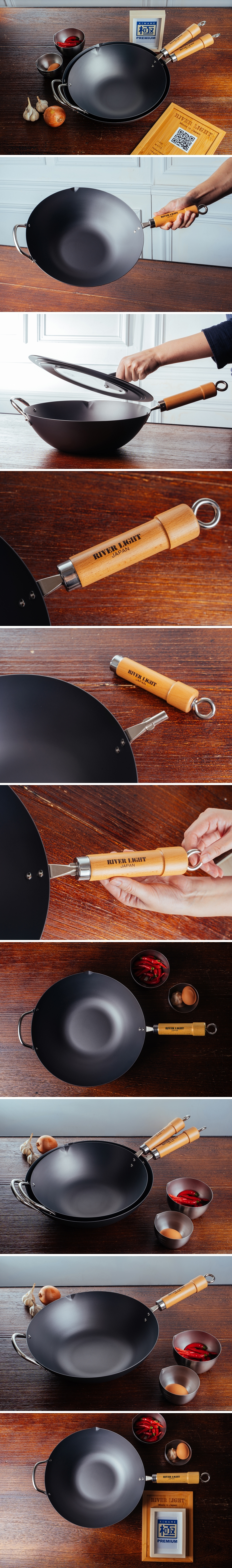 中華鍋之外的他種鍋型,更在鍋柄上展現細節,材質是表面經過精工細磨的實木,柄上烙有「RIVER LIGHT」字樣的立體雕刻
