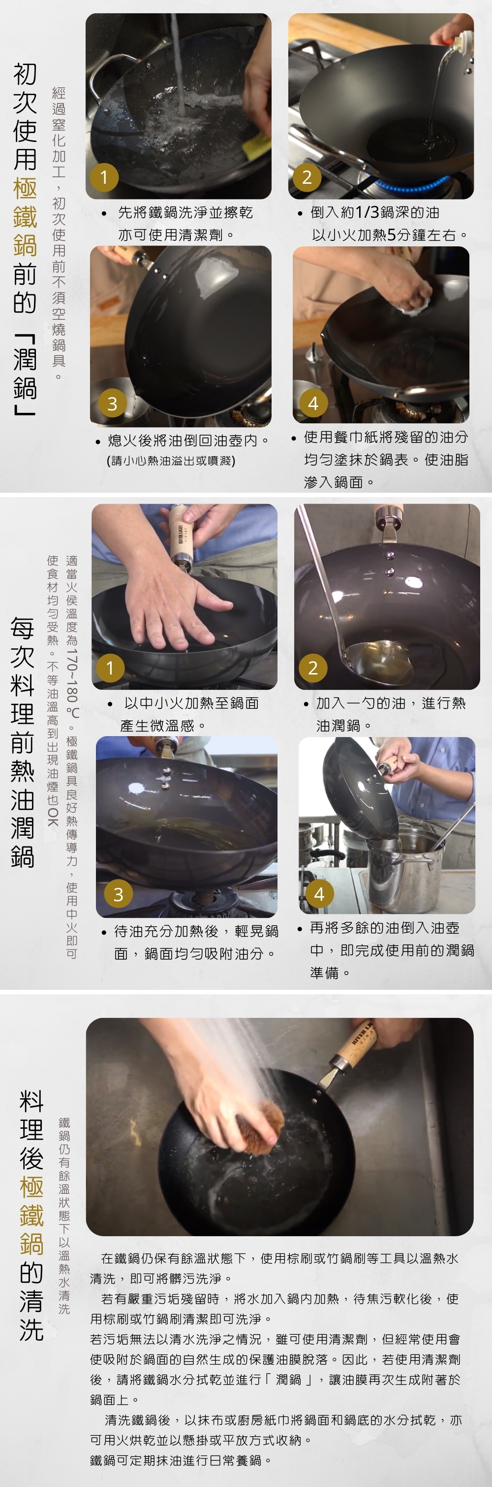 只要於每次使用前潤鍋,鐵鍋等同不沾鍋效果。調理後定期清潔保養,堅固耐用,是可用一輩子的鐵鍋。