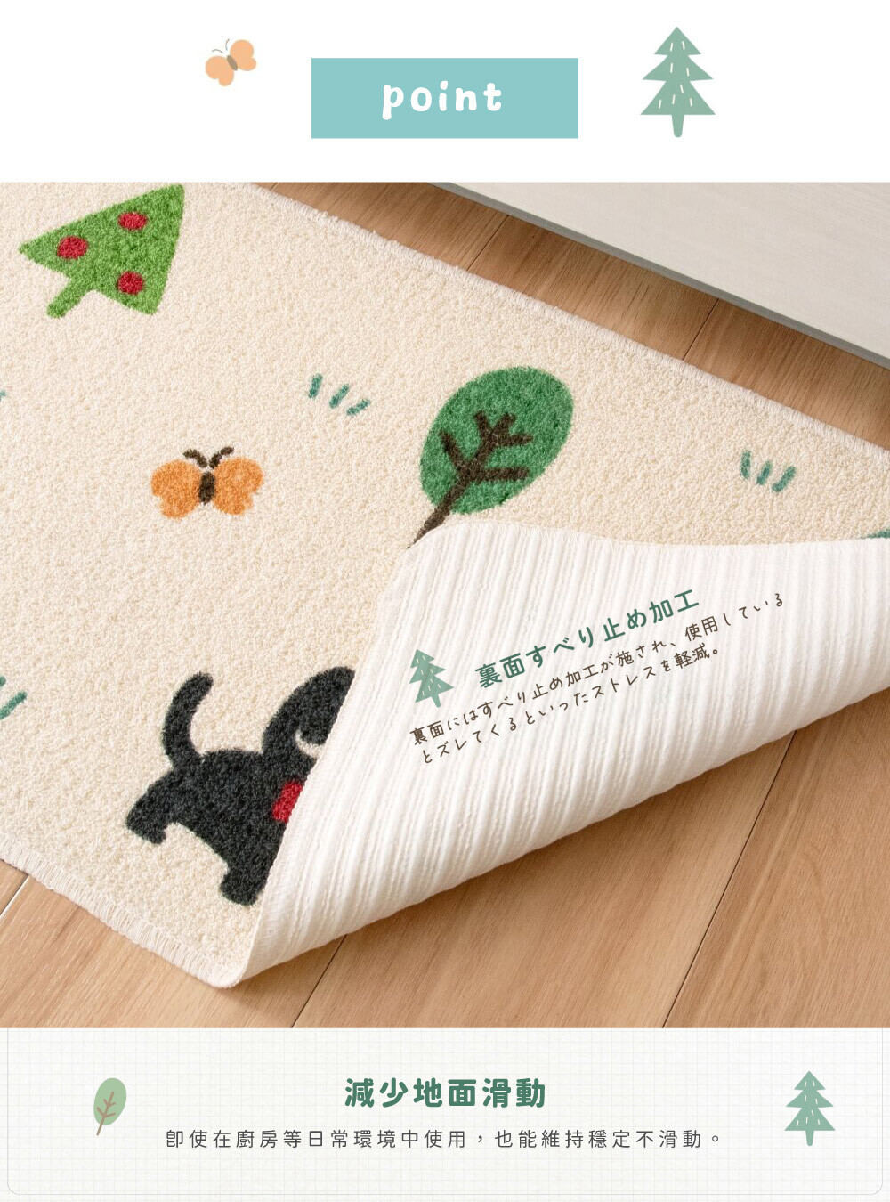 ●背面止滑加工,即使在廚房走動也不易移位,安全更有保障。