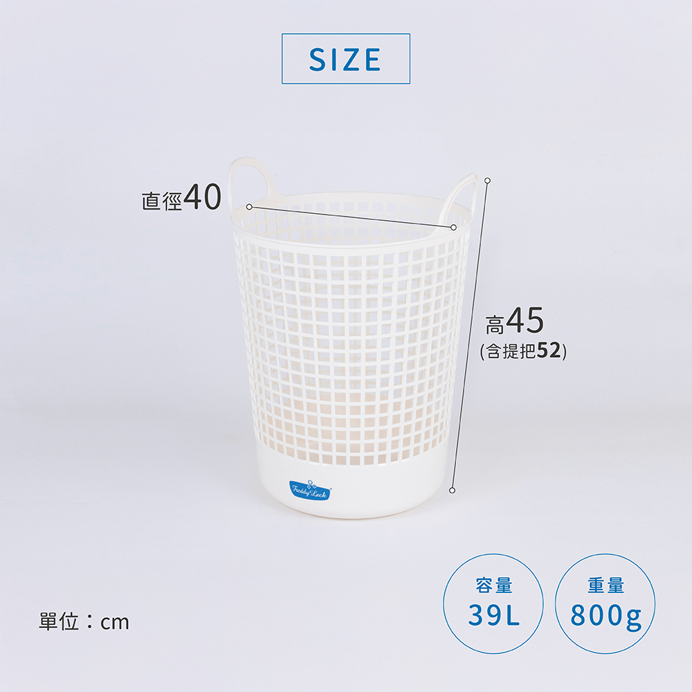 39L大小非常適合週末集中清洗衣服或家庭人數較多的洗衣置物籃。各種零散的貼身衣物或毛巾類、體積較大的床單,大容量且深度足夠都能妥善放入。寬口設計,方便取放衣物也是其一大特點。