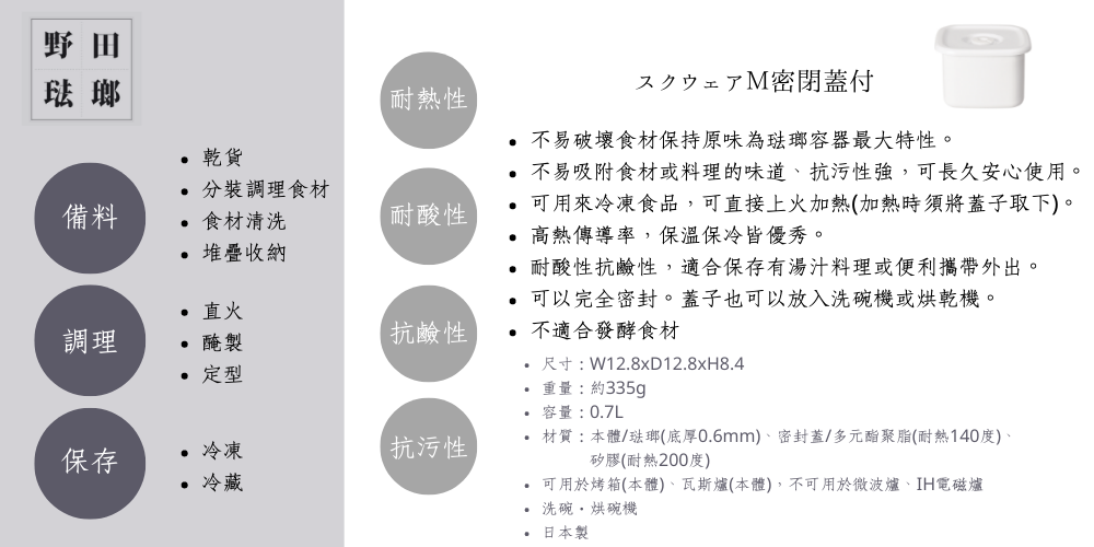 《野田琺瑯》方型密封蓋琺瑯保存容器 M