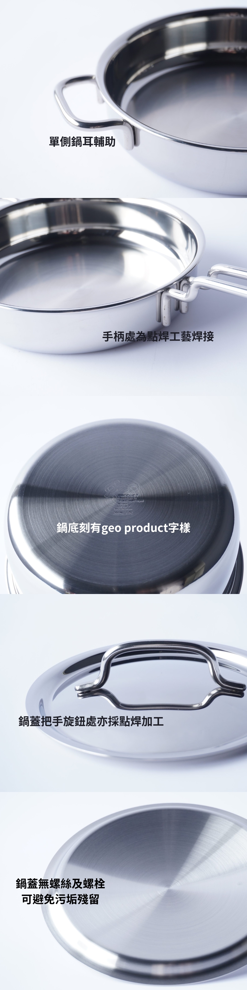 Geo採用 全鍋 7 層結構,以不鏽鋼夾層鋁合金製成,具備卓越的導熱性與均勻受熱特性,能有效節能並縮短烹調時間。
