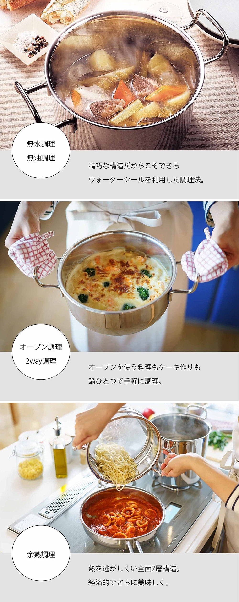使用時在整個鍋身全體均勻導熱後,利用鍋蓋與鍋子緊密結合後的密閉效果來有效保持定溫定壓,以大幅縮短加熱的時間,有效利用導熱性佳的特點將食物本身的油脂或水分逼出來進行烹調。