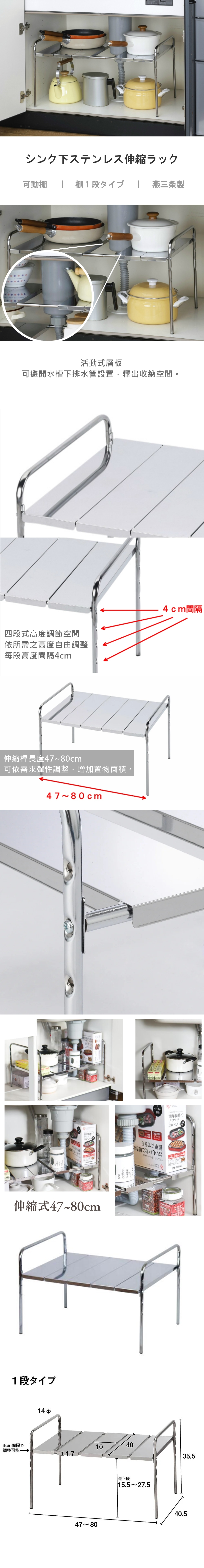 可配合家中水槽下空間調整使用,可將鍋具、平底鍋或調理用過濾網等廚房用品完整收納的伸縮式收納架。