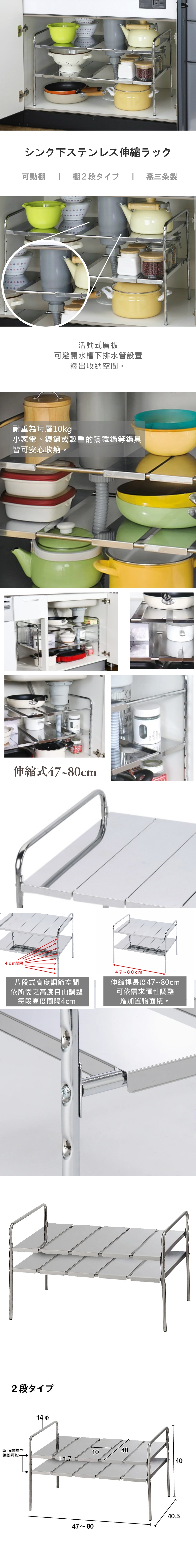 可配合家中水槽下空間調整使用,可將鍋具、平底鍋或調理用過濾網等廚房用品完整收納的伸縮式收納架。