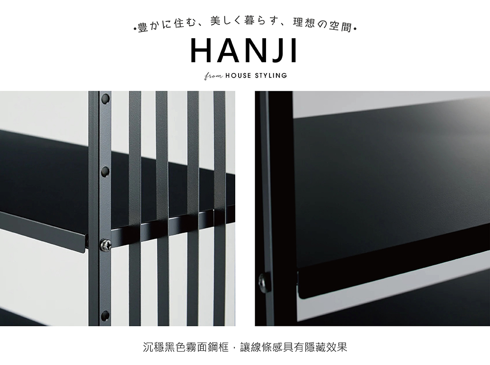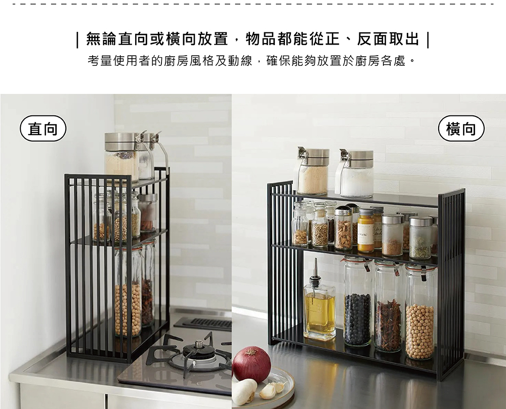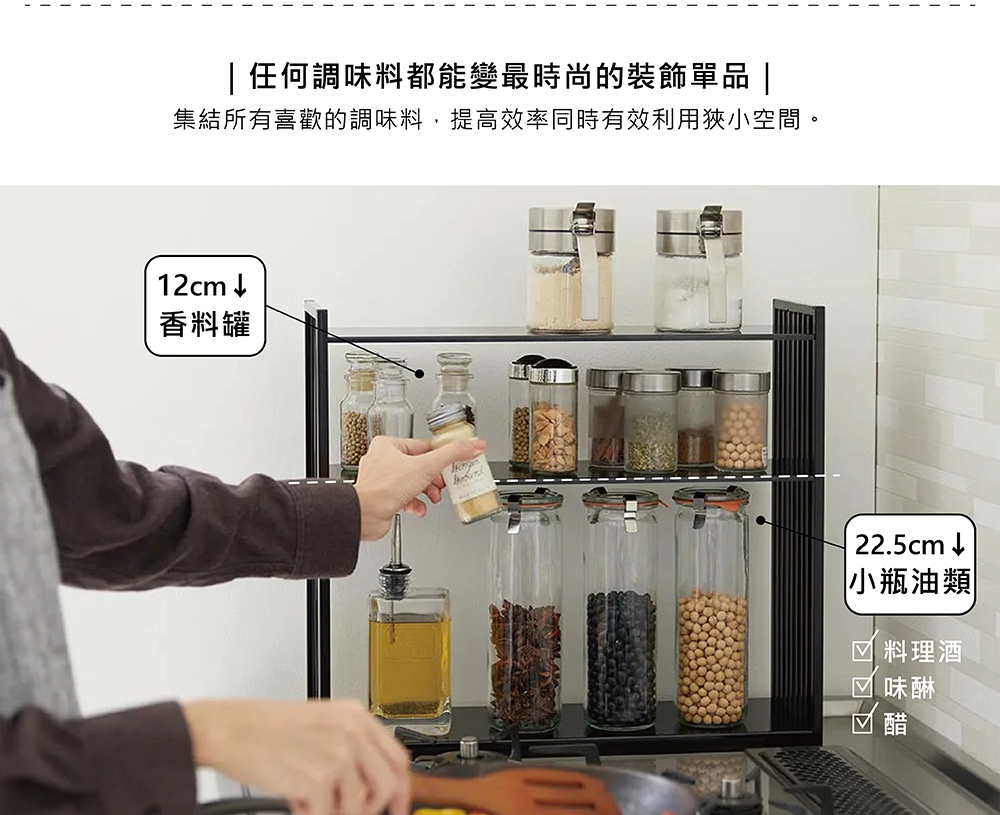 以曜石黑垂直線條狀設計的收納置物架,能將香料、香草等調味料全部收納在一起。