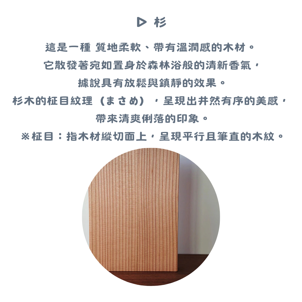 選用不易變形且柔韌的杉木柾目材,重量僅20g,兼具杉木特有的柔韌性與講究人體工學握持設計。