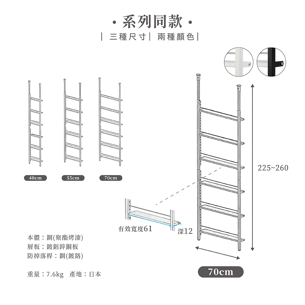 頂天立地支撐式設計穩固耐用,6片活動式層板,可收納大量毛巾及清潔劑用品等。