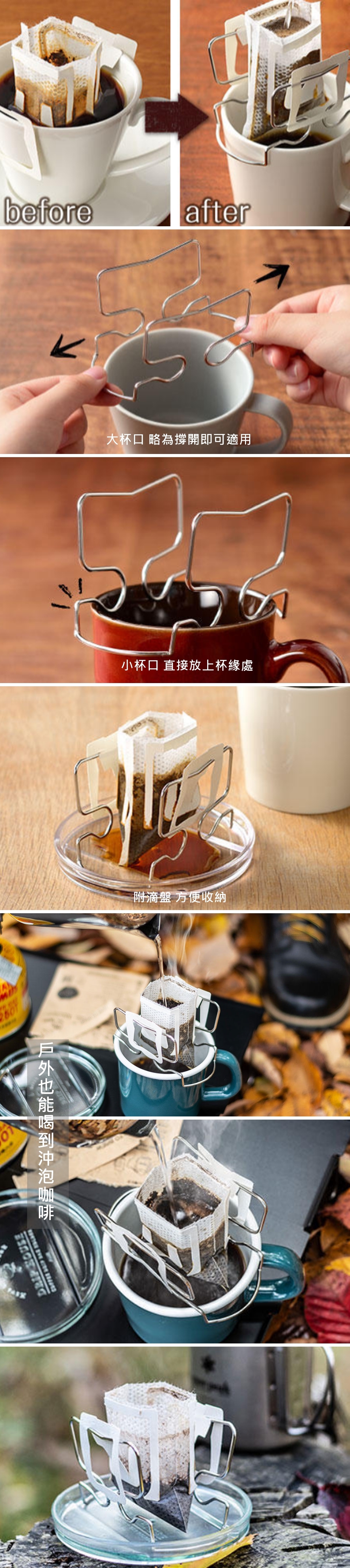 濾架外觀適用多種杯型,不會浸泡在杯內,不會有多餘雜味,可滴漏出原始咖啡風味。