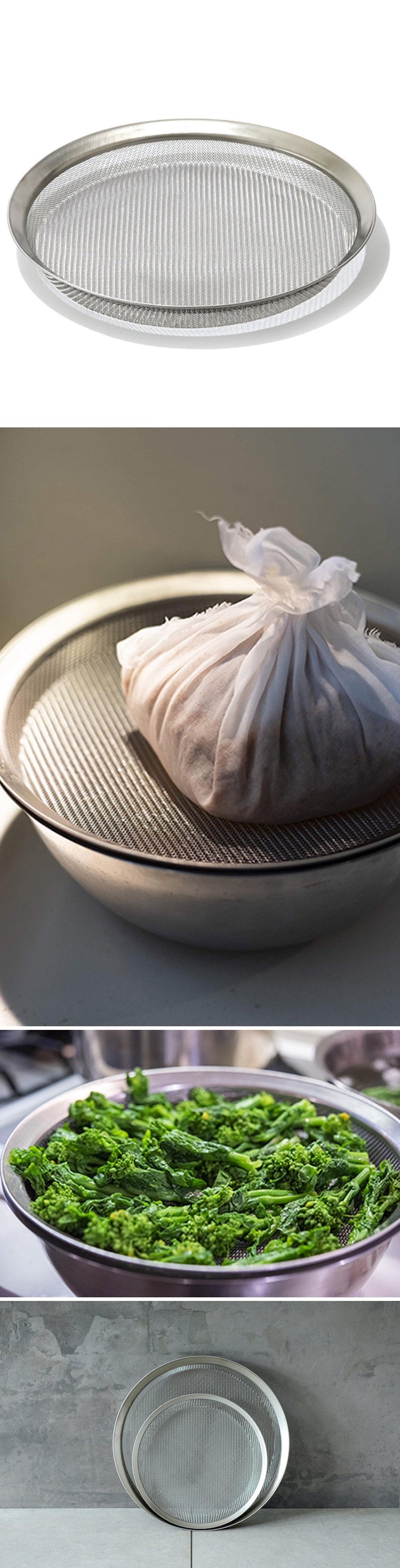 ■與同系列調理碗搭配使用,尺寸契合穩定不晃動,無需擔心食材瀝水時仍有食材浸泡在水中,連最後一滴水都可完全瀝乾,可達到良好的瀝水效果。如搭配過濾紗布或棉蒸布使用,可過濾出透明度高的高品質高湯。