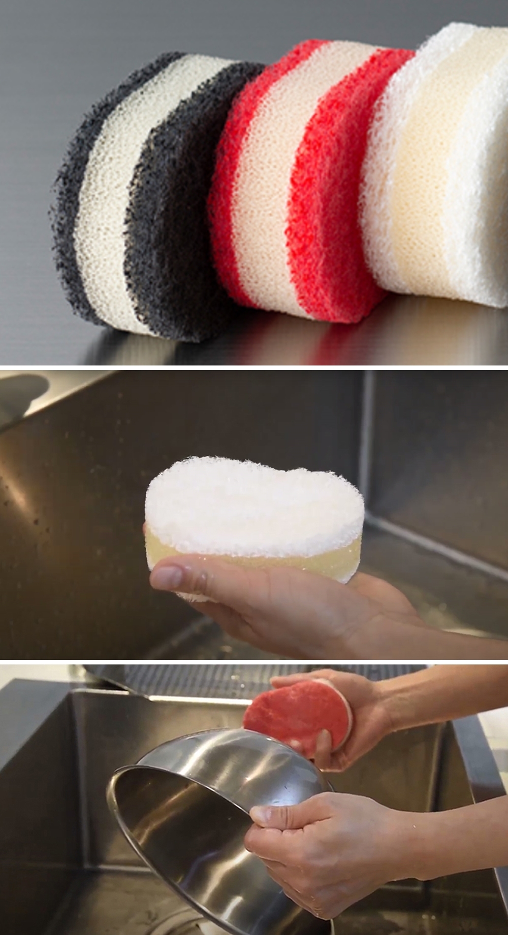 ■海綿為尼龍與聚氨酯材質兩層構造設計。上下兩側使用尼龍不織布,不會損傷手或餐具保有柔軟觸感,中間聚氨酯材質則特別講究其密度與彈性不易被壓扁,在手上輕輕搓揉即可揉出大量泡泡。