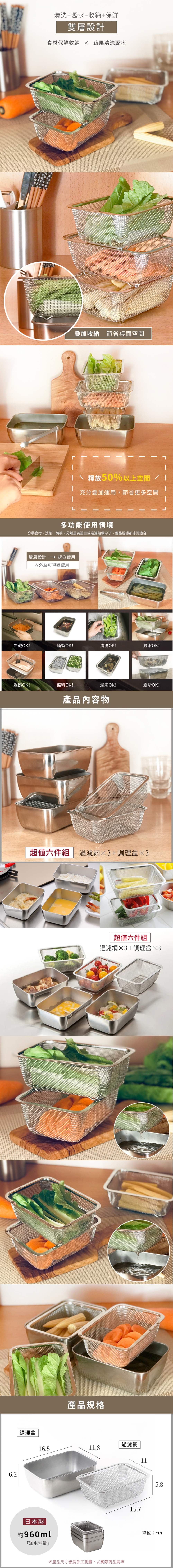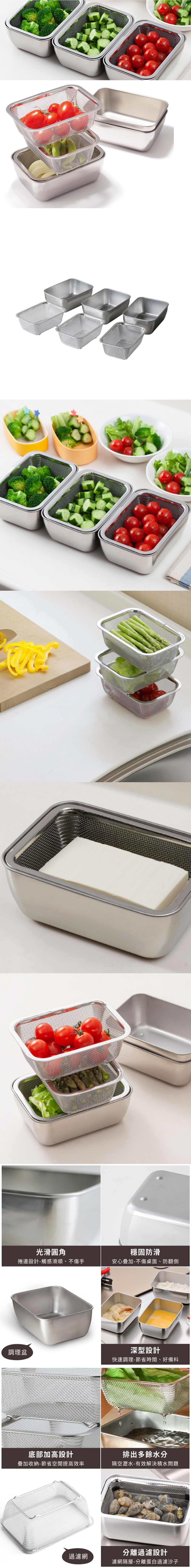 可用來分裝食材、洗菜、醃製、分離蛋黃蛋白或事前過濾蛤蠣的沙子、優格過濾都非常適合