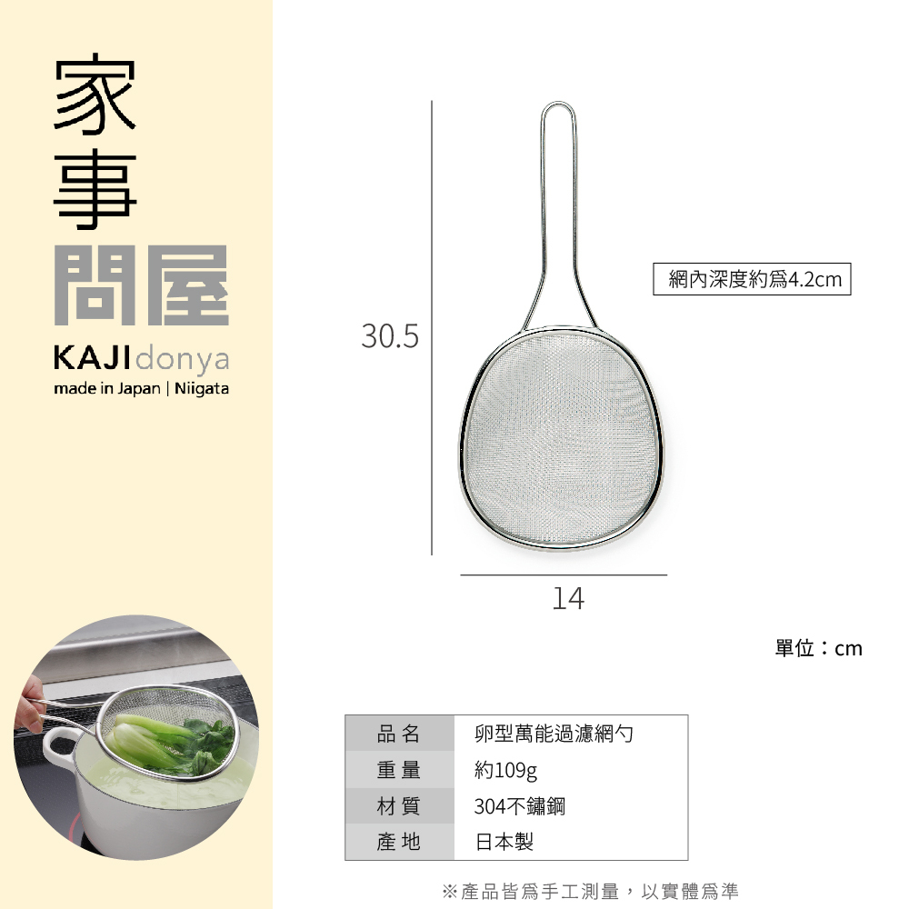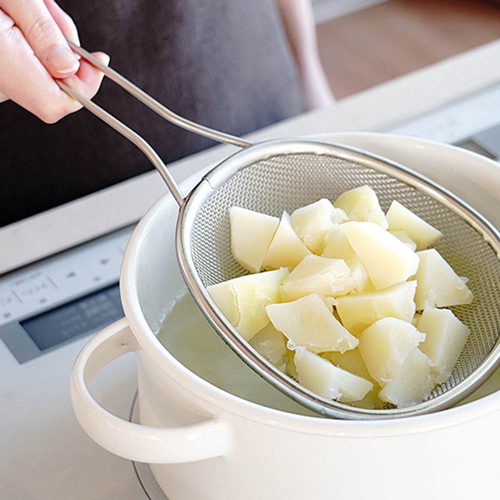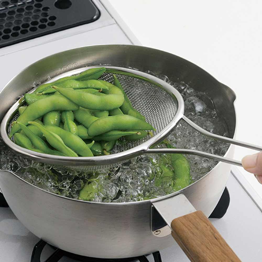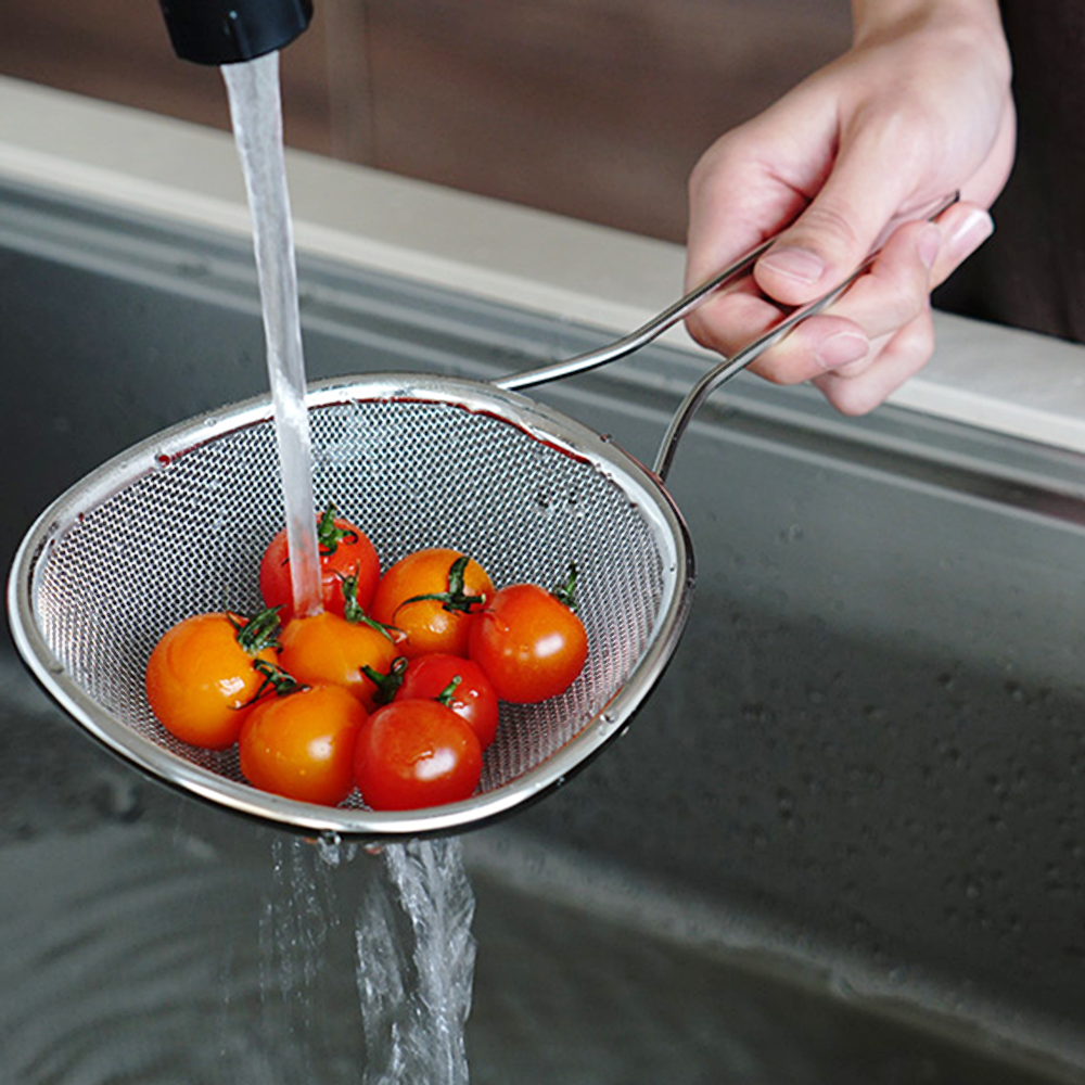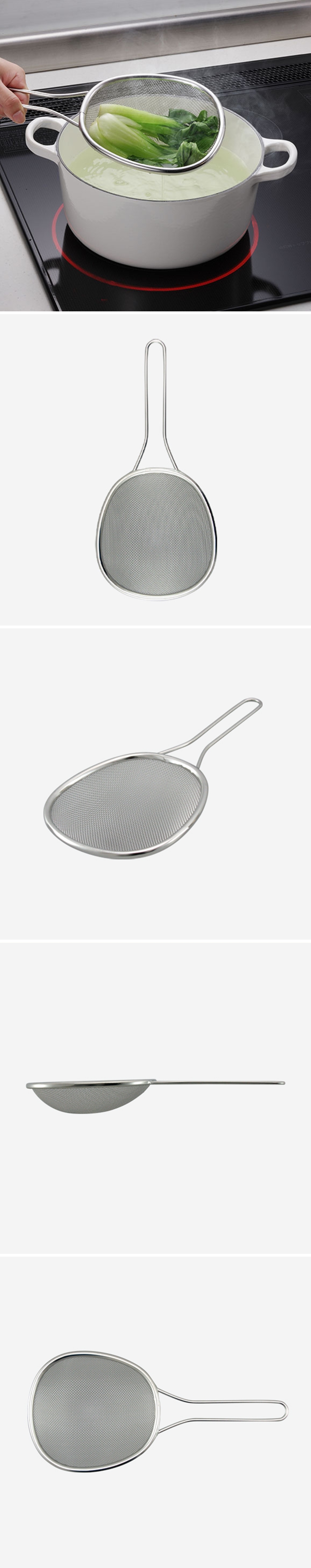 濾網為平面球狀型設計,適合深入鍋底或以側面撈起食材,且因有深度,更可一次將食材全部撈起。