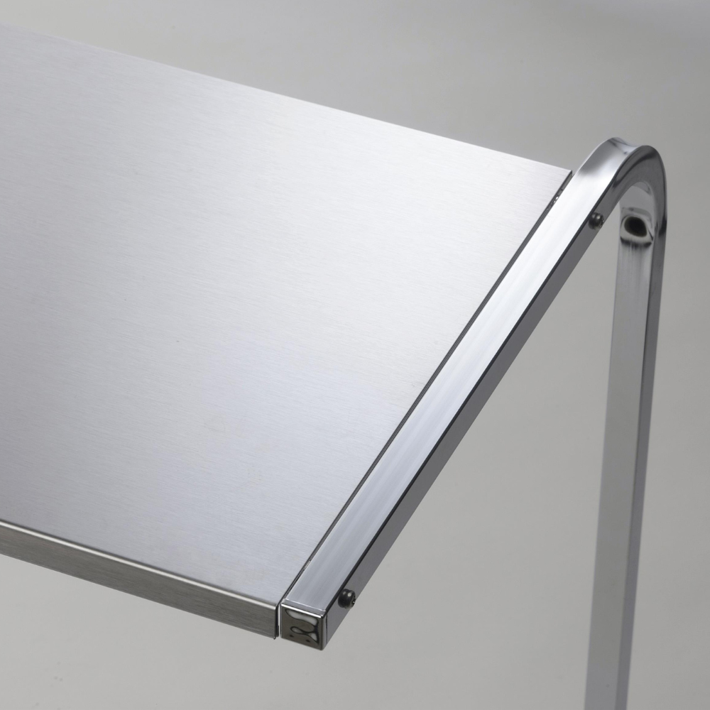 由於前方沒有柱子,腳架設計平滑,方便收納與工作,所以即使安裝在水槽上方,也能舒適作業。從側邊取物時不會造成動線干擾。桌面採用耐熱、耐水的不鏽鋼材質。