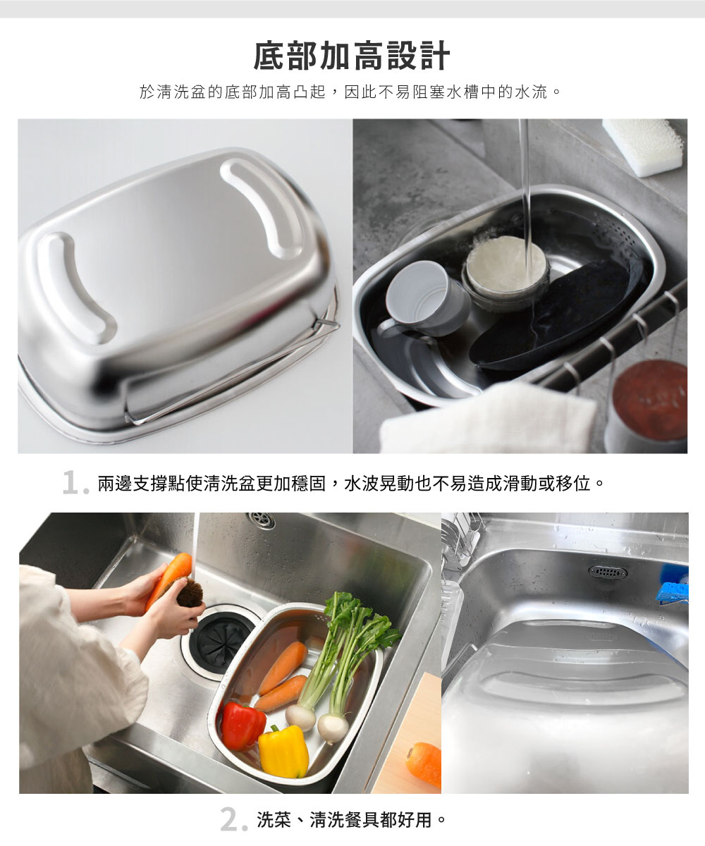 由於清洗盆有微高起的底部設計因此不會阻塞水槽中的水流。