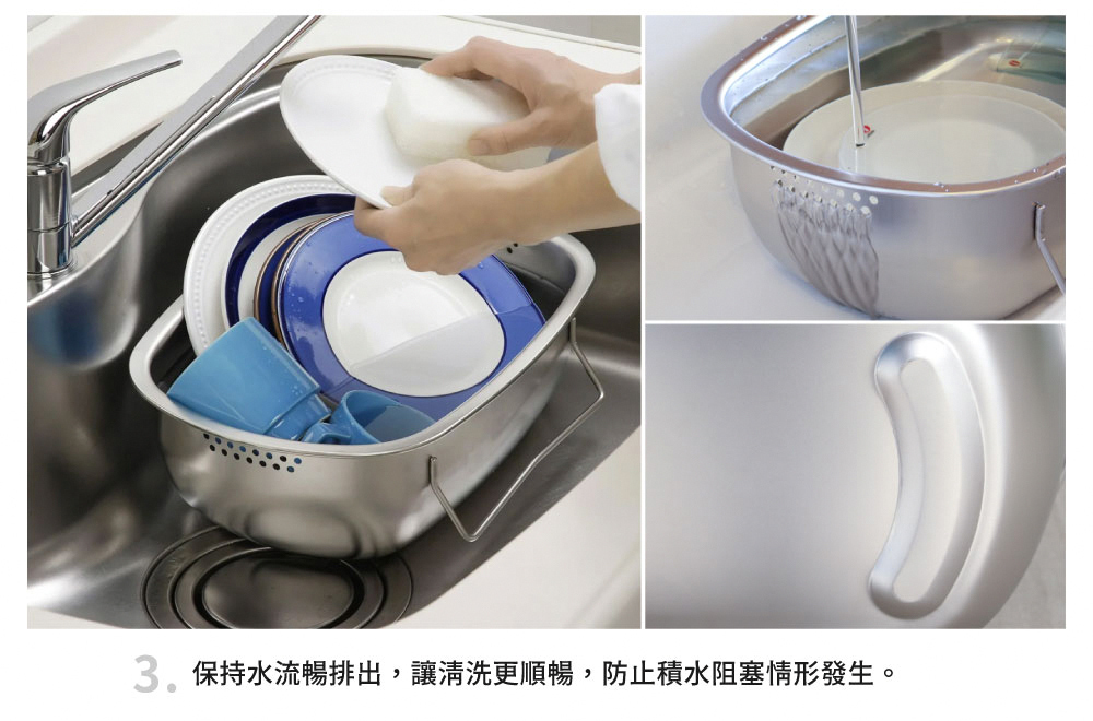 清洗盆兩側都有排水孔因此不會讓水滿溢,可以防止清洗中的食材溢出。