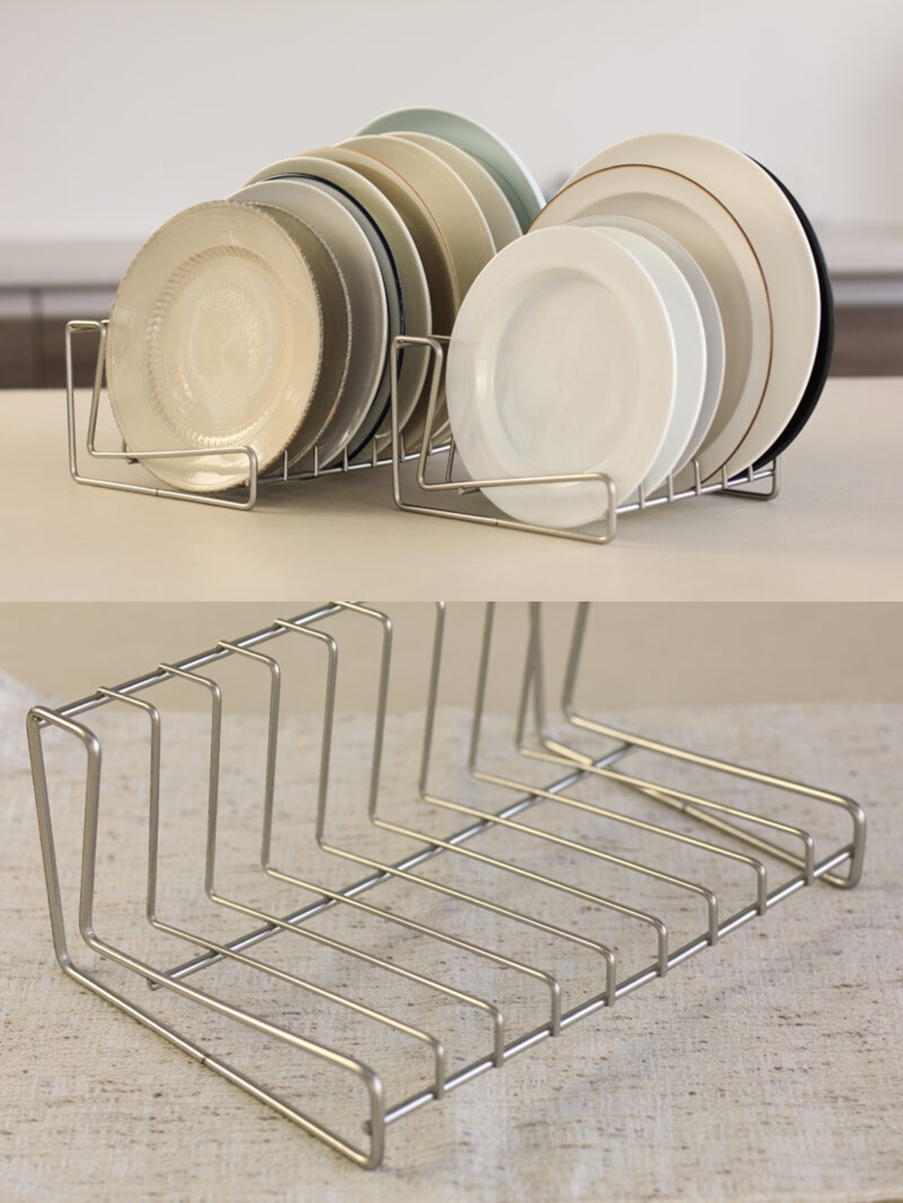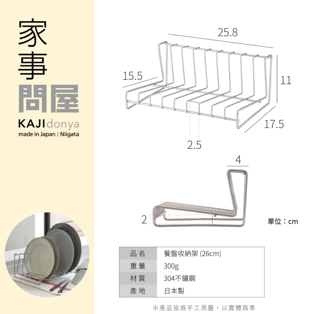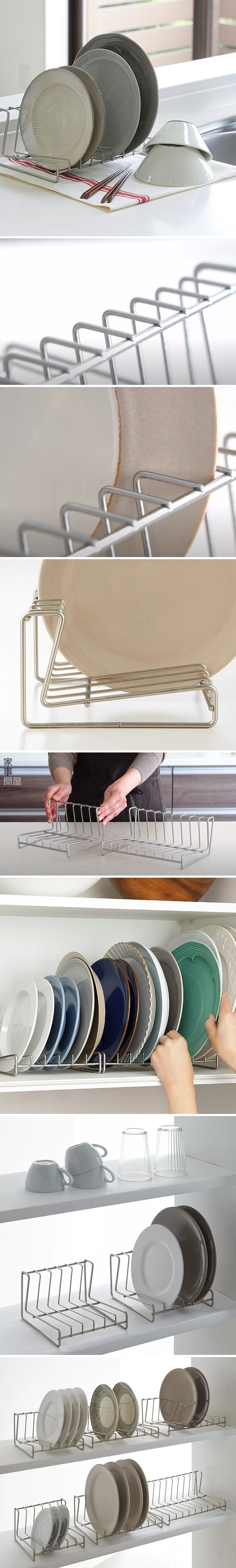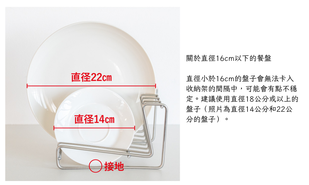 可將餐盤直立收納好拿取,適用直徑約18~24cm的一般平盤,26cm款可放置9個平盤。