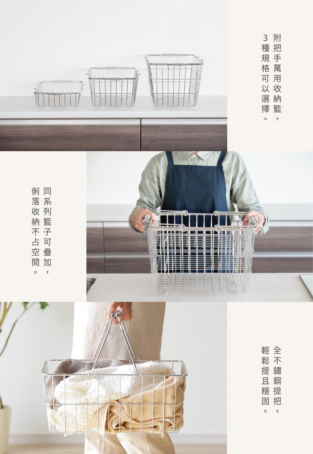 全不鏽鋼製附把手的萬用收納籃,耐水氣可長久使用!
