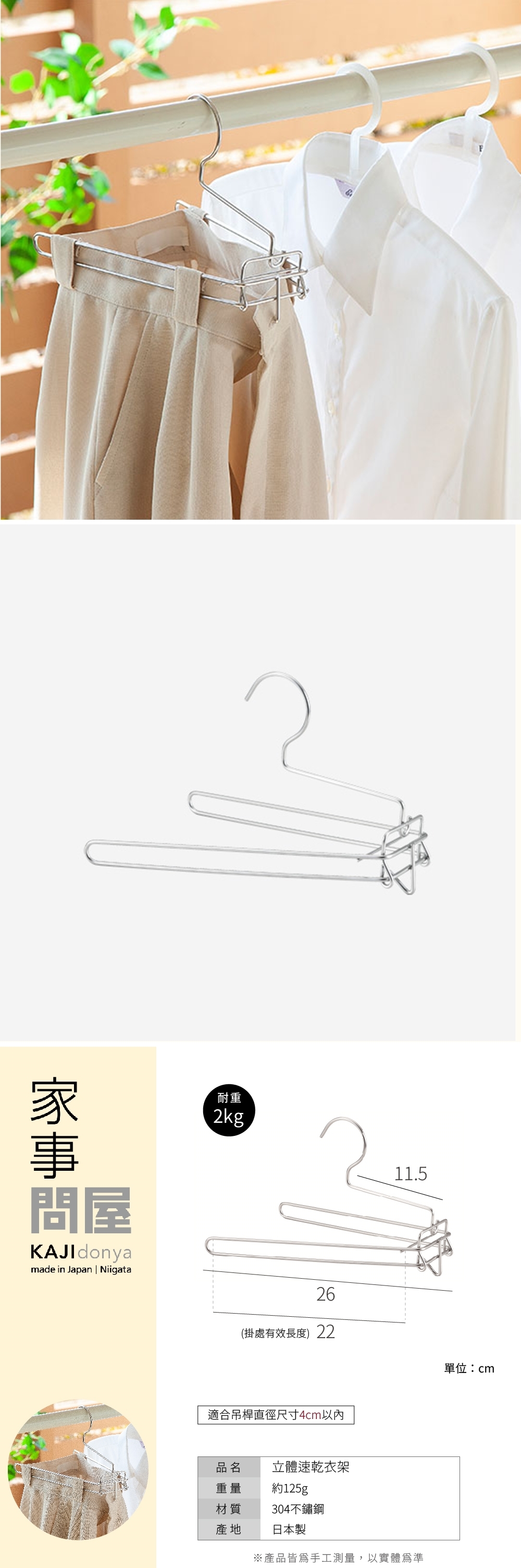 本衣架設計將衣架穿過腰帶孔使的立體吊掛方式,可有效加速褲子晾乾!