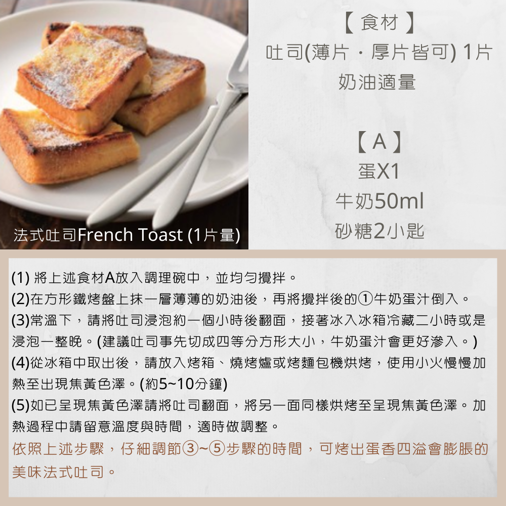 ■方形吐司切片可完整放入,在充分浸泡蛋液後,即可放入烤箱烘烤。