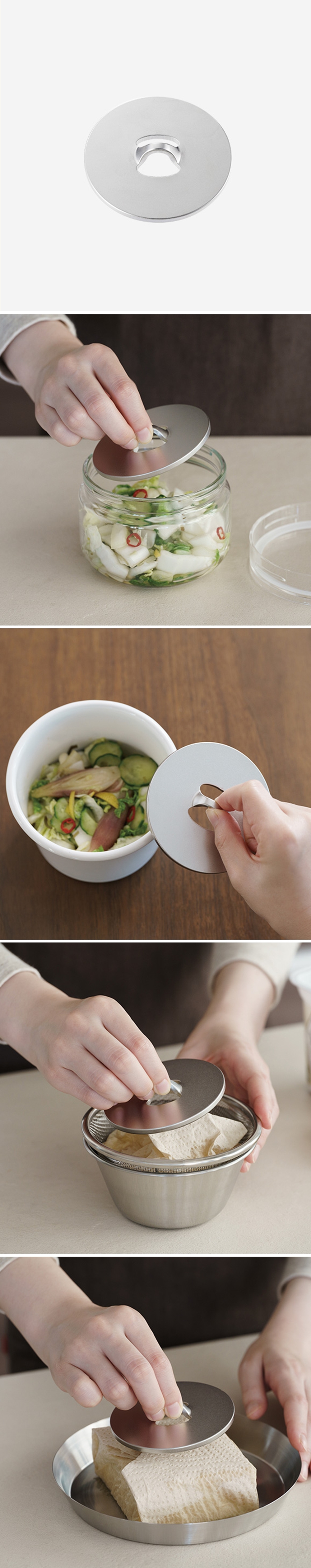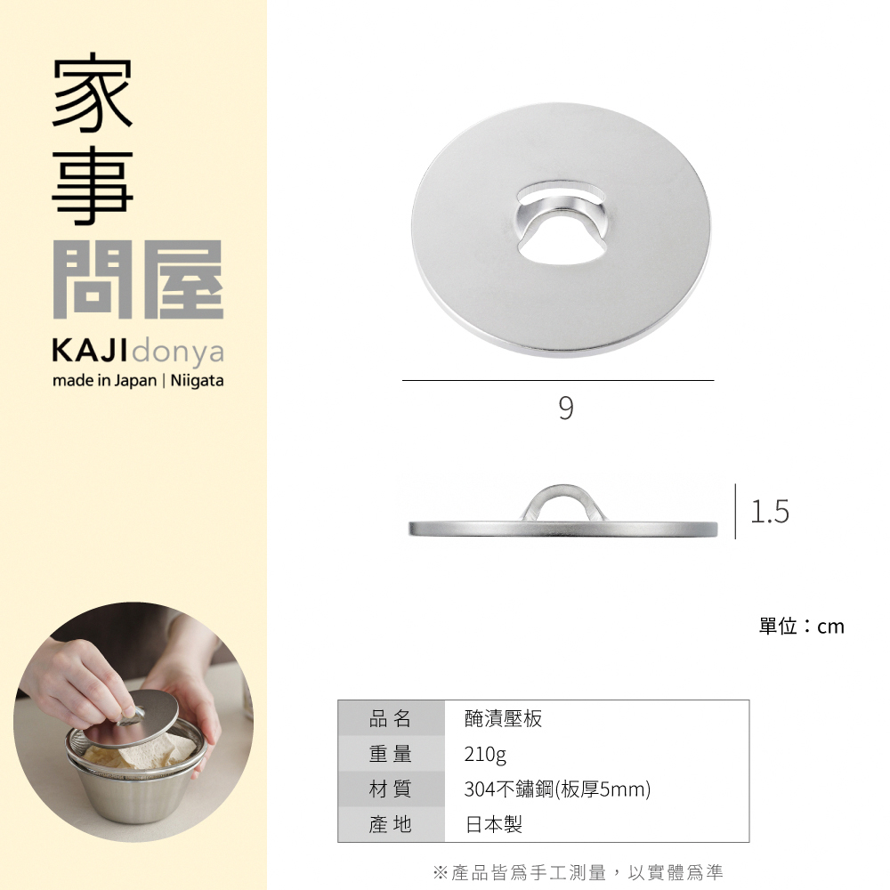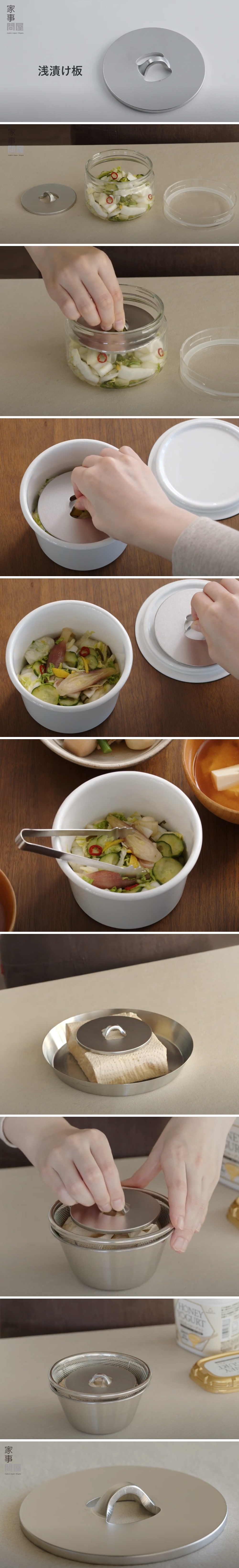 方便醃漬調理的不鏽鋼壓板,輕巧尺寸可直接放在小型醃漬容器或小碗中使用。醃漬後可食用時可直接端上桌!