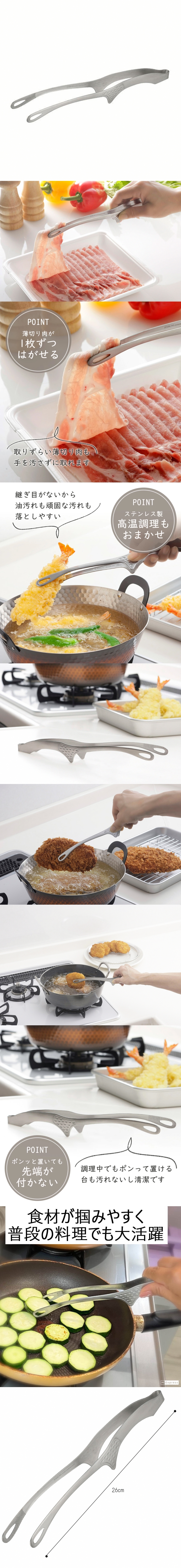 夾口尖端薄而堅固,可輕鬆分離重疊黏著的食材,方便夾取。尖端內側經紋型鋸齒加工,可增加夾取時的摩擦力。長度夠長能讓手部遠離熱源,做為油炸夾使用。