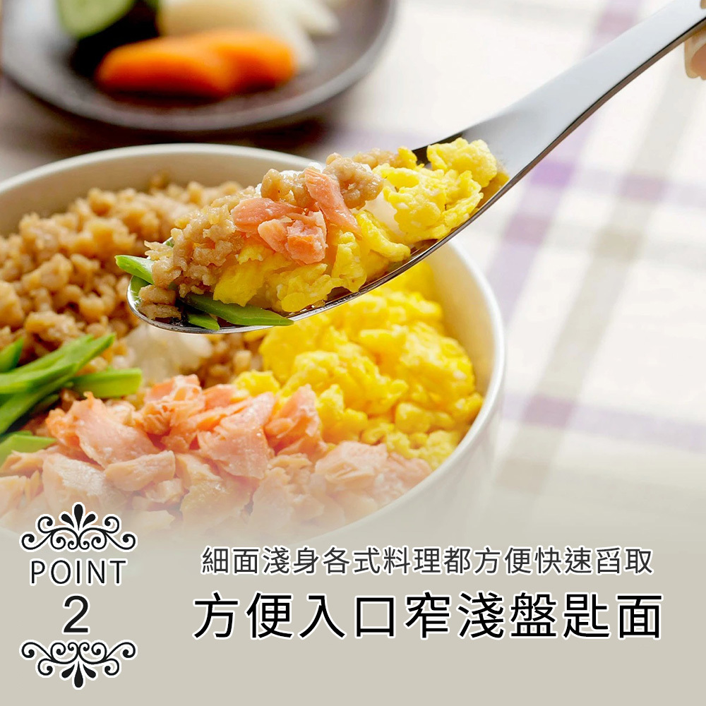 淺盤型匙面,不論是丼飯、粥、咖哩,還是炒飯,都可快速地舀取入口。
