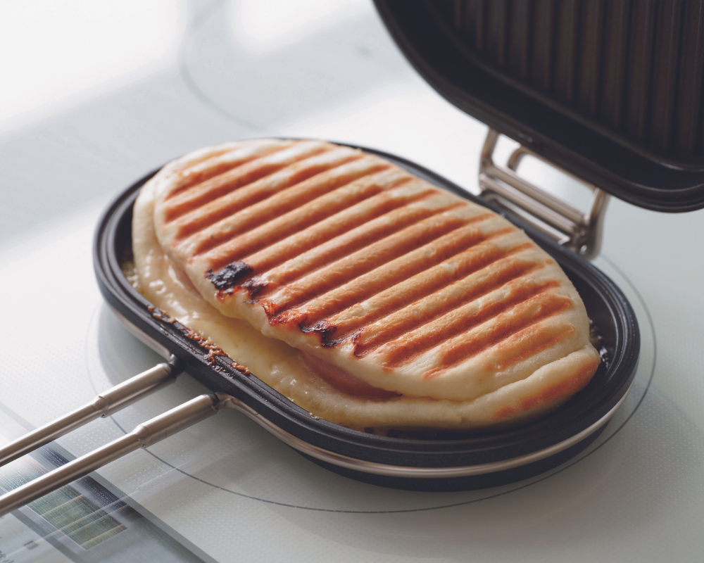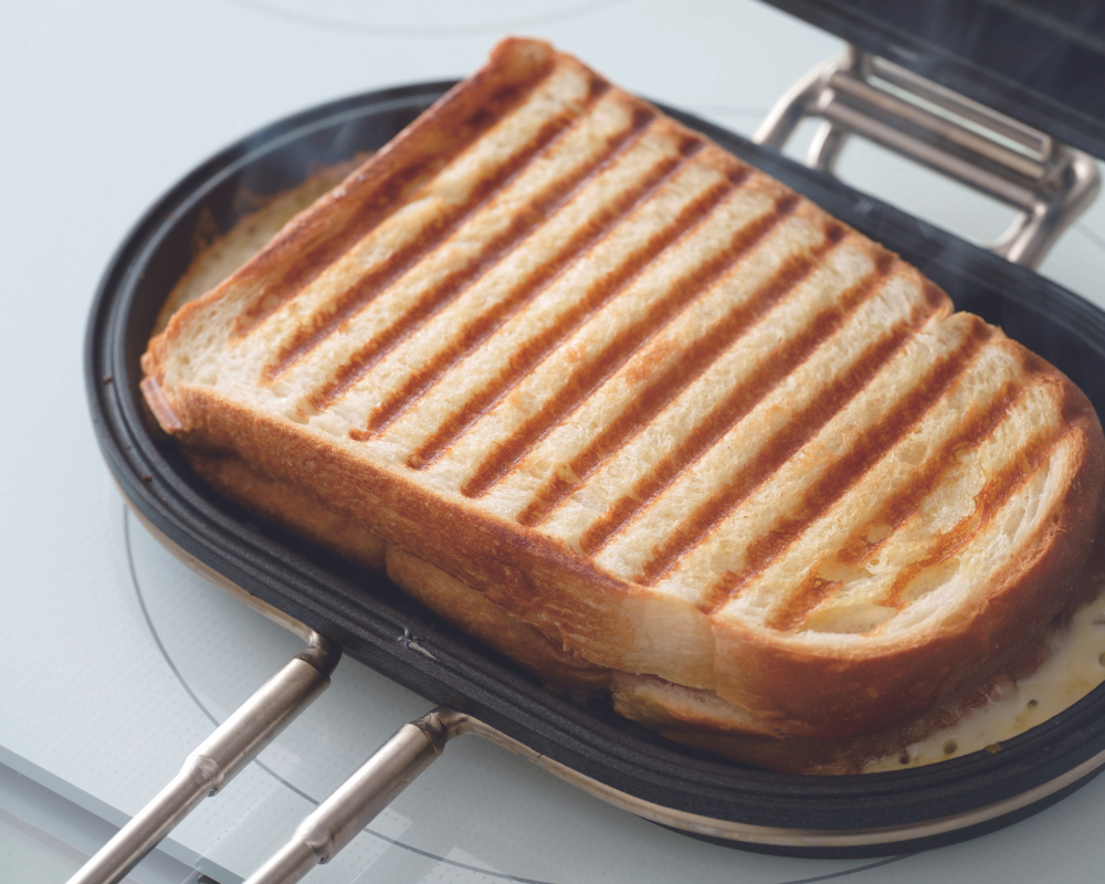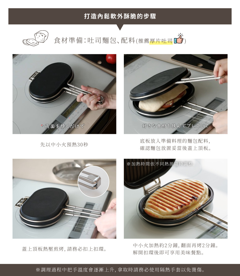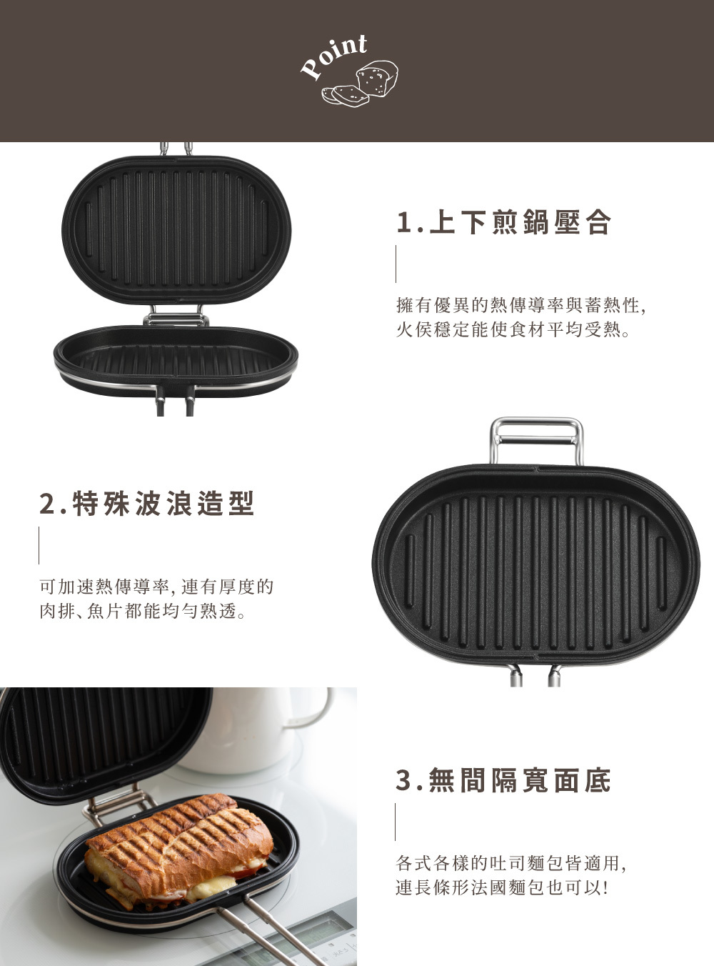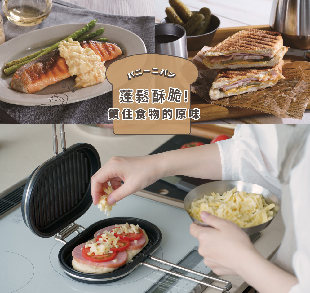 無間隔寬面烘烤鍋底,各式各樣的吐司麵包皆適用。可放入自己喜歡的食材,輕鬆完成屬於自己口味的熱壓帕尼尼三明治。