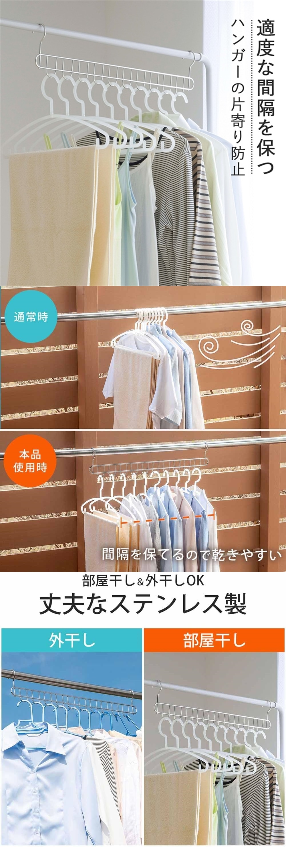 可以使衣物保持適當的距離,讓風更容易通過縮短晾乾時間。衣架只要掛入孔中就能防止衣架偏移。