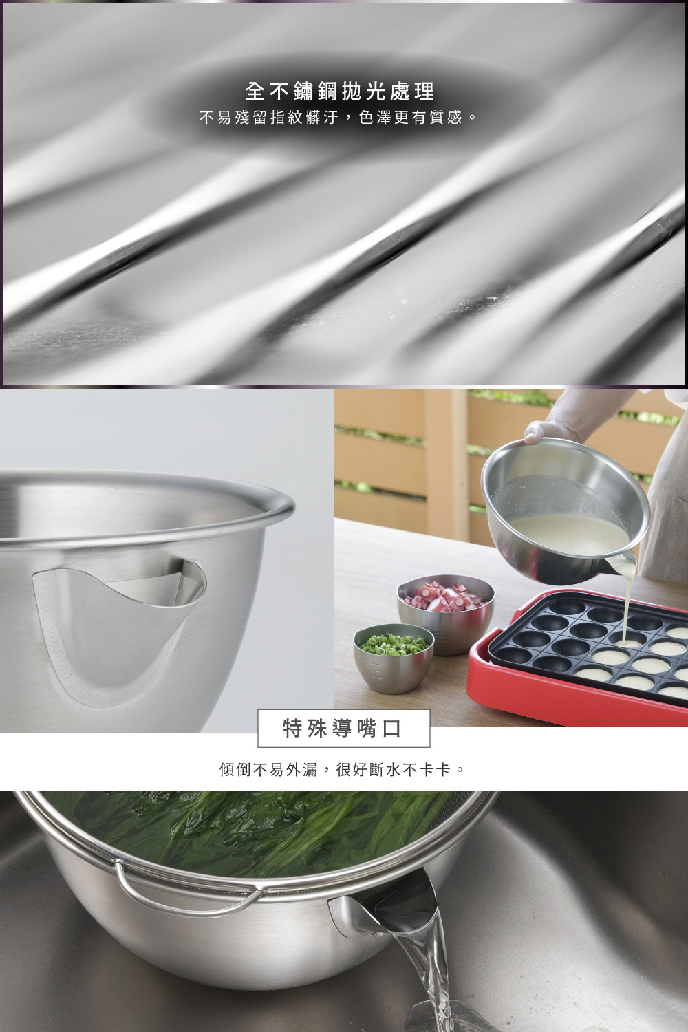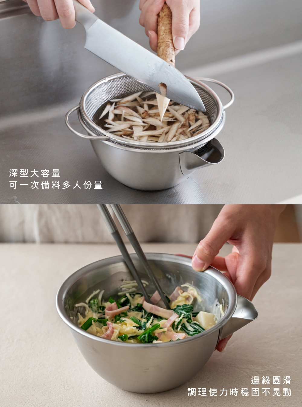 ■調理盆附有嘴口設計,可適當排除水分,避免多餘水分溢出。