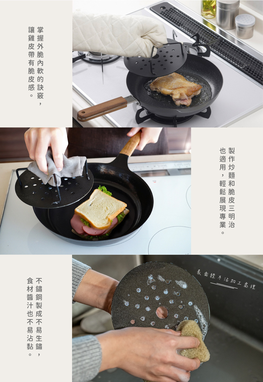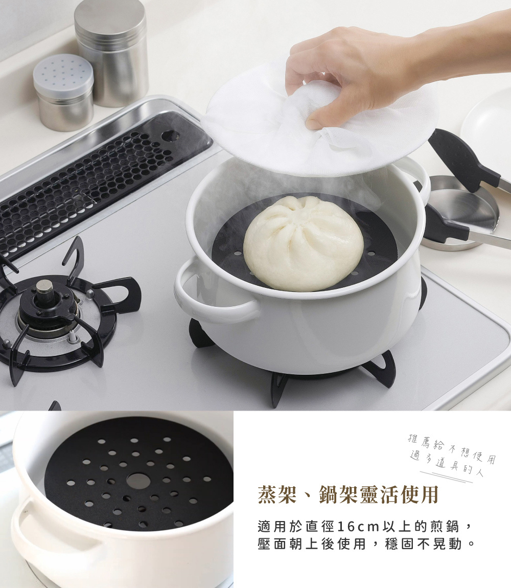 ●壓面朝上後也可作為蒸架使用,適用於直徑16cm以上的煎鍋。