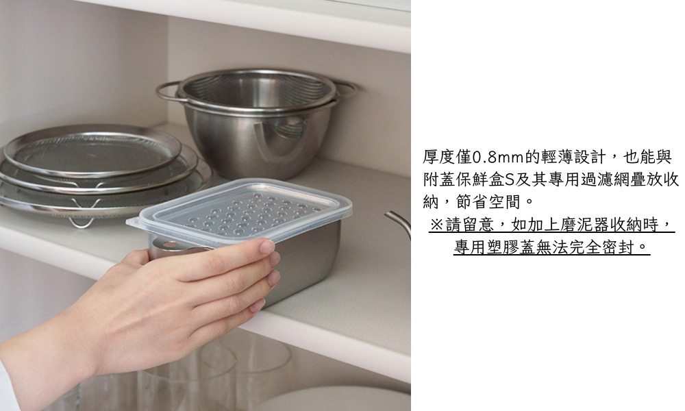 可與同品牌之《家事問屋》附蓋保鮮盒S與其專用過濾網內一同使用,薄型設計能連同附蓋保鮮盒S疊放,實現利落收納。