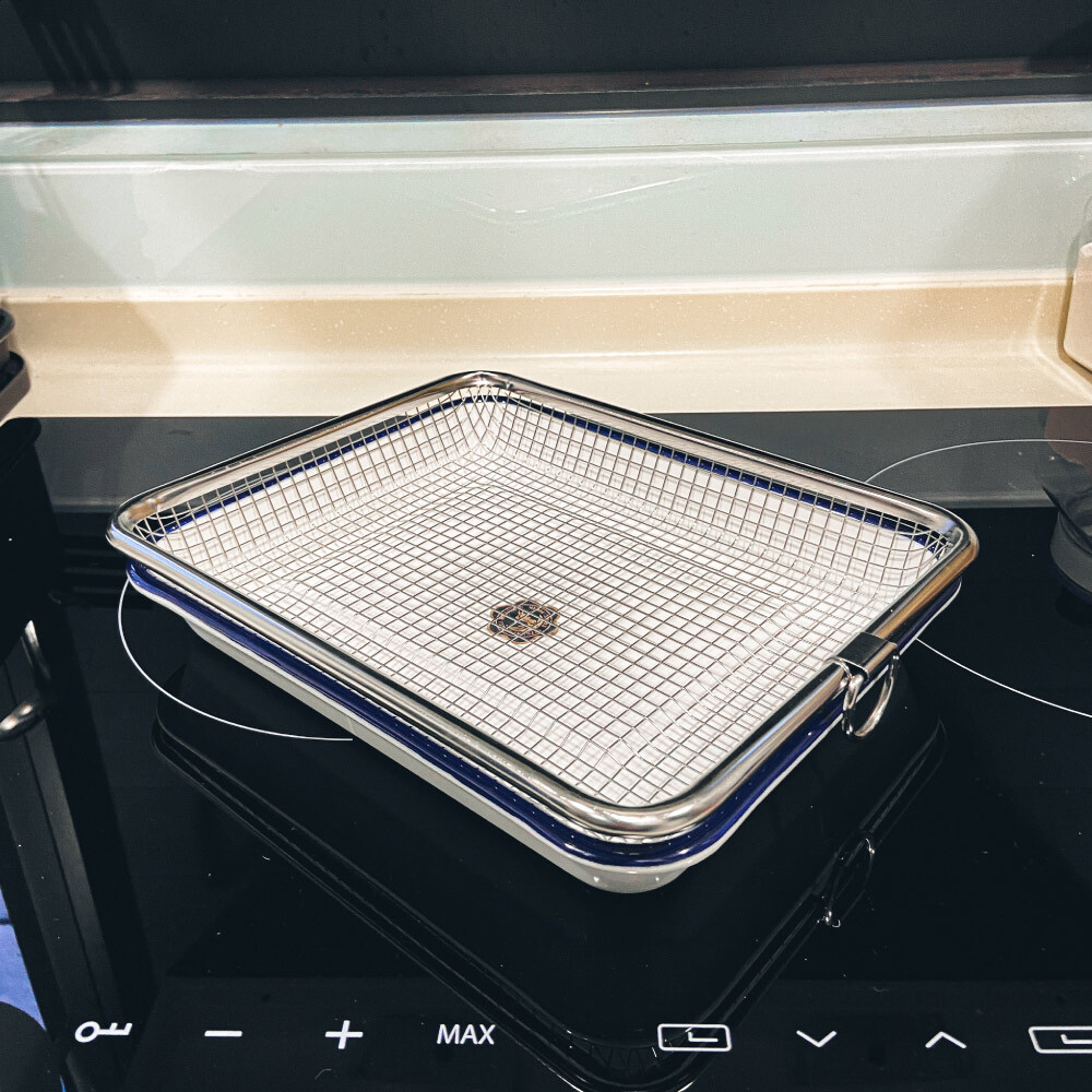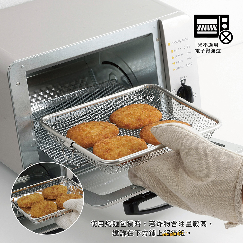剛好符合燒烤爐內空間的專用烤網,將冷掉的炸雞、炸物等放在烤網上加熱,不僅能讓多餘的油脂滴落至下方,還能讓食物重新變得酥脆、健康。