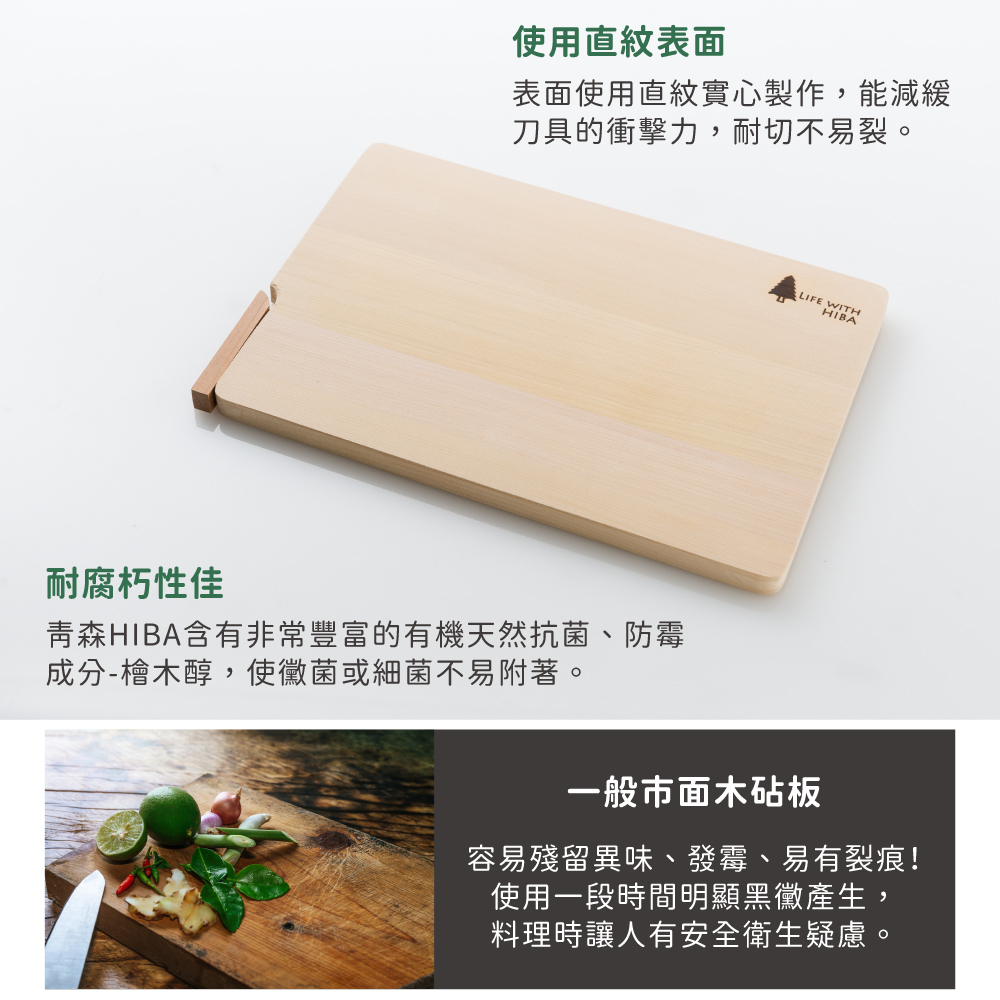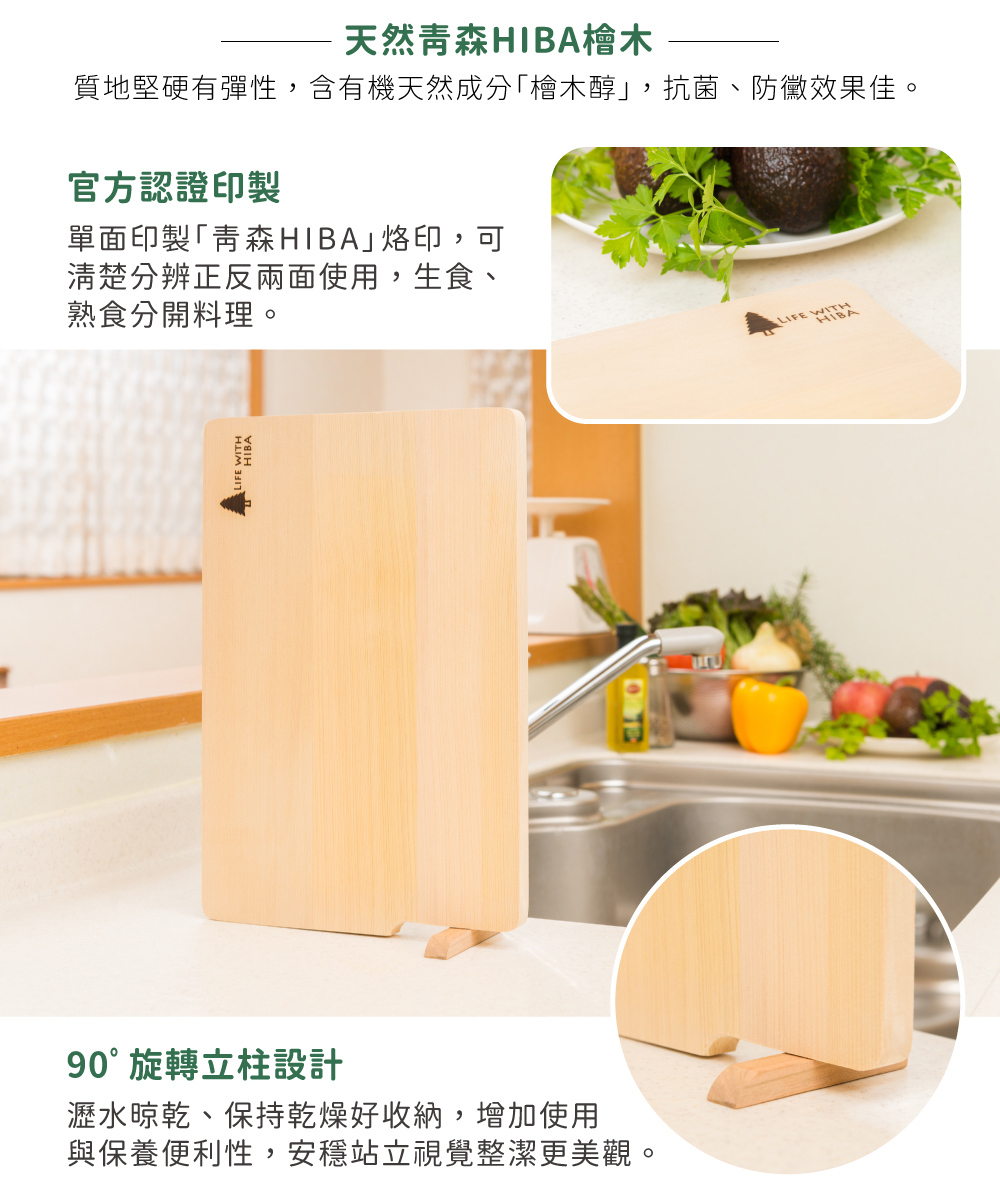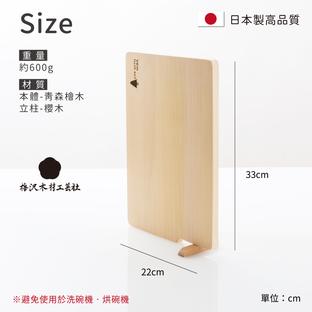 附轉角可站立檜木砧板讓砧板更快乾,100%採用天然青森檜木,具抗菌、防黴效果。