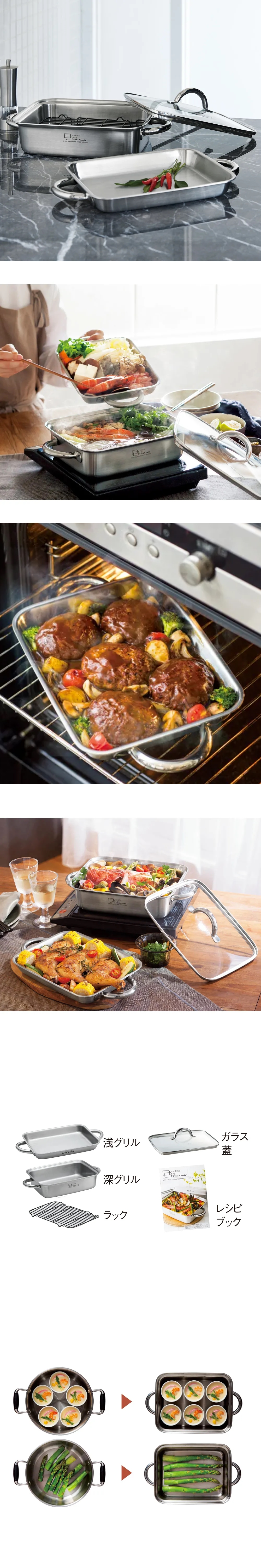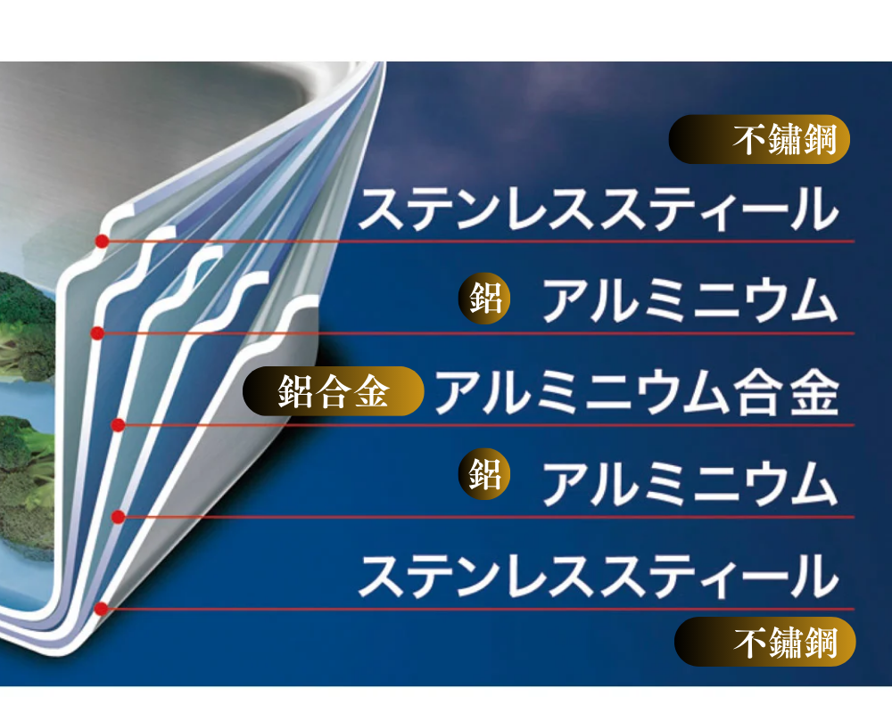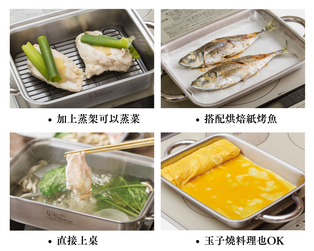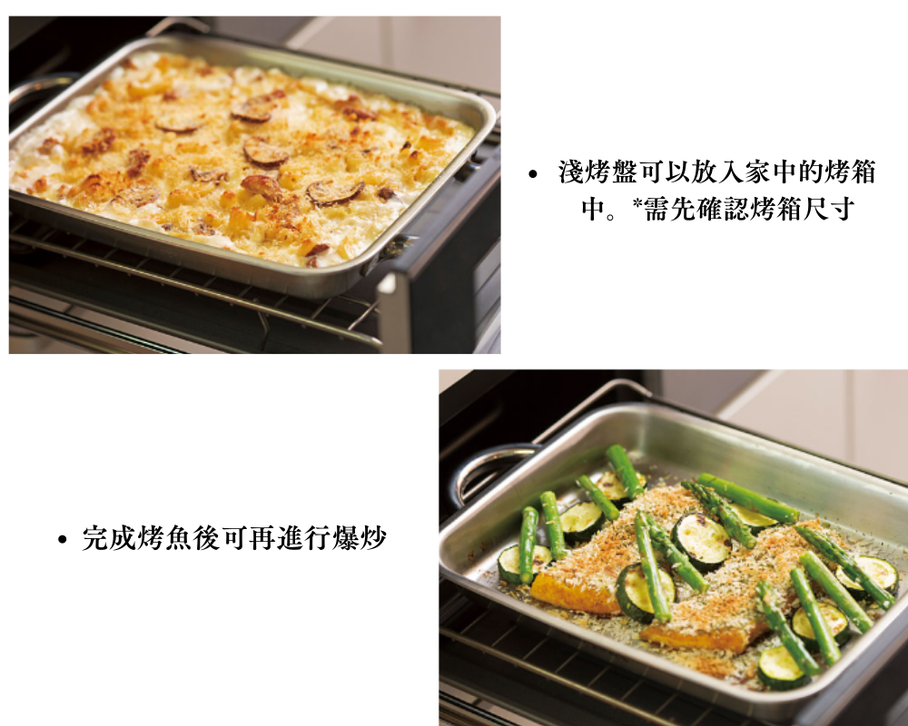 本烤鍋從內到外,以不鏽鋼與鋁合金的五層複合金構造,實現高效保溫且快速均勻熱傳導高效能,淺烤鍋也能當作備用上蓋來使用。本鍋不挑爐具,瓦斯爐IH爐或直接放進烤箱、烤魚爐加熱也OK!