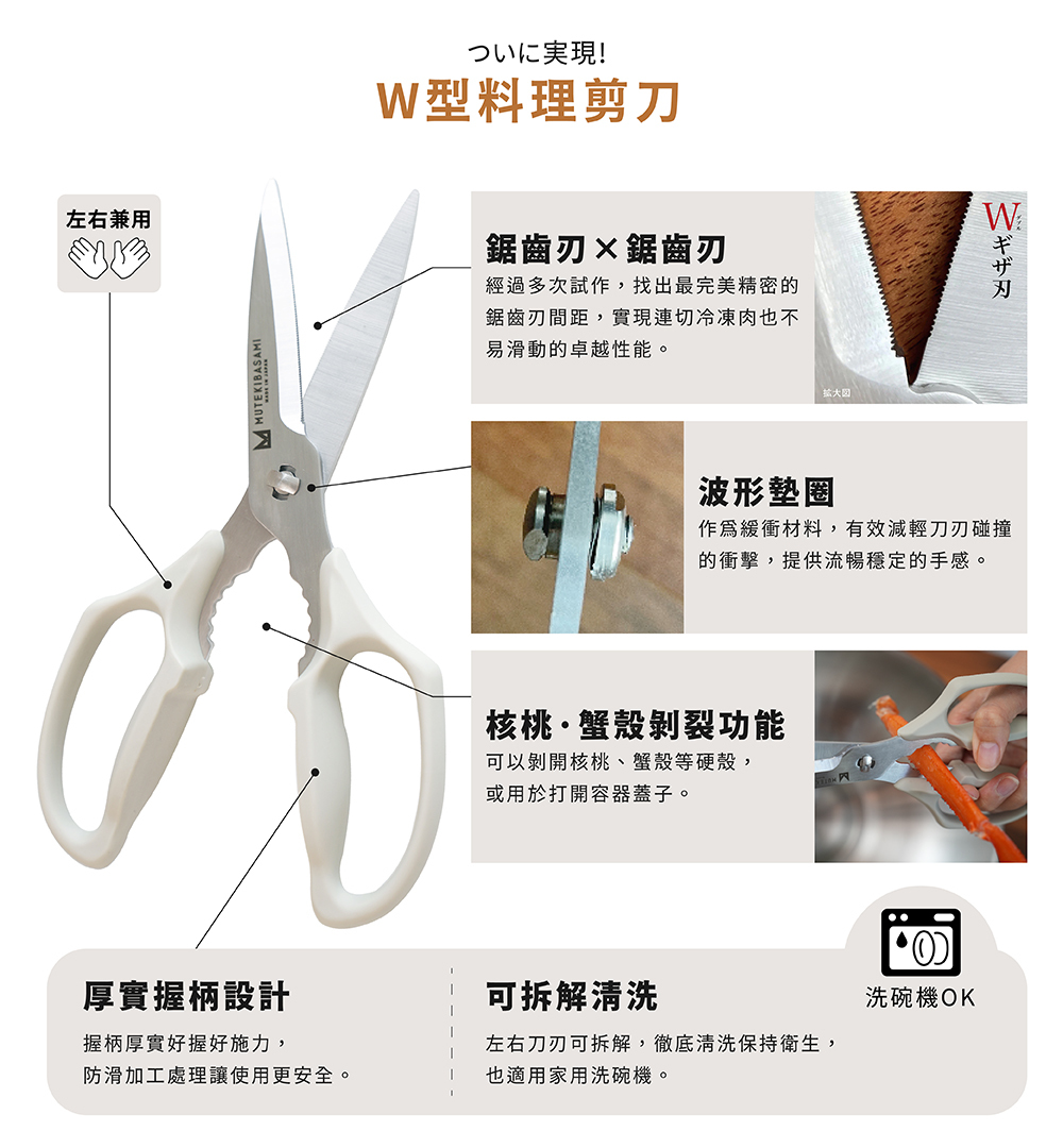 MUTEKIBASAMI系列料理剪刀,與市面上料理剪刀一樣是以專為慣用右手之設計,但因特殊設計而左手也可使用!