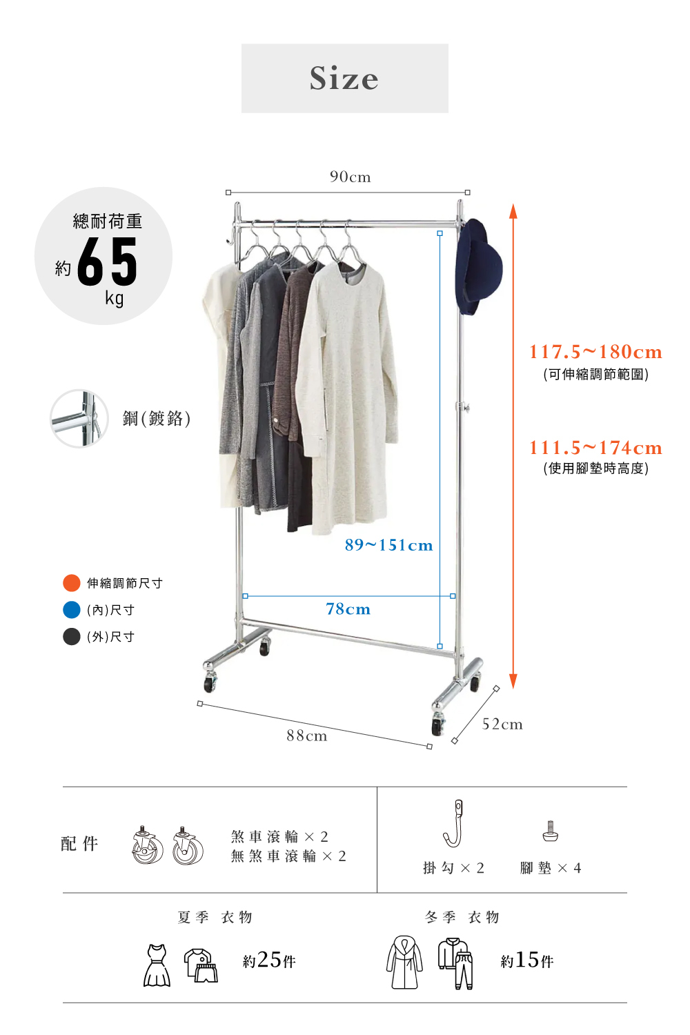 ■尺寸:全寬90×深52×高117.5~180cm(使用腳墊時高度約111.5~174cm)