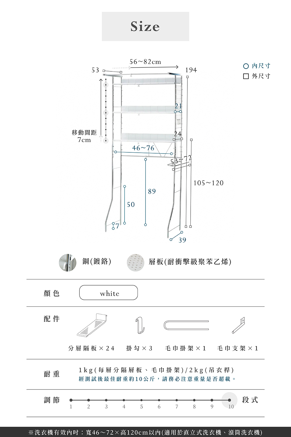 ■適用洗衣機內吋:寬46~72cm,分層隔板最低段離地高度為105~120cm