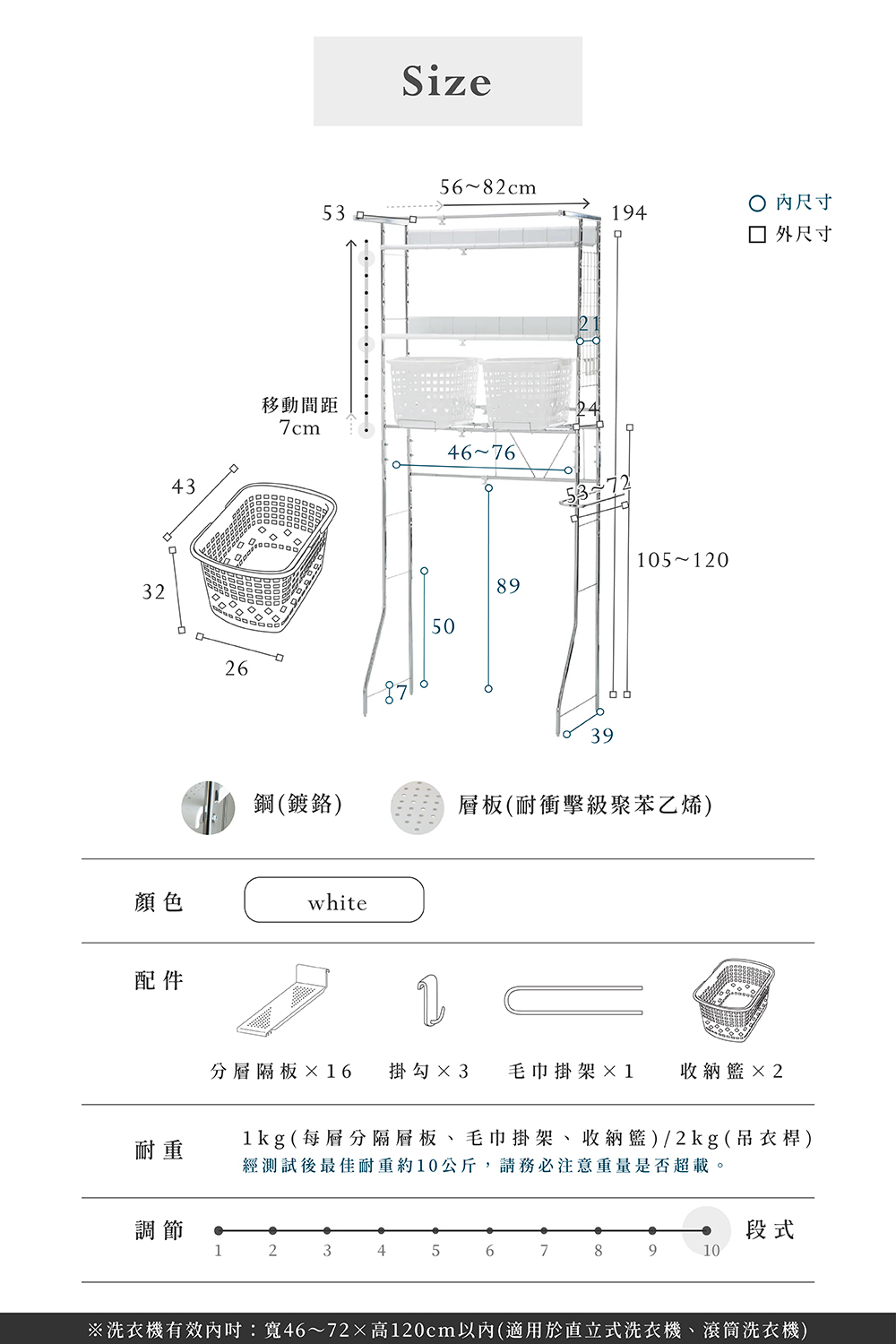 鋼管寬度1.2cm,能安裝在狹窄空間裡的人氣洗衣機置物架。