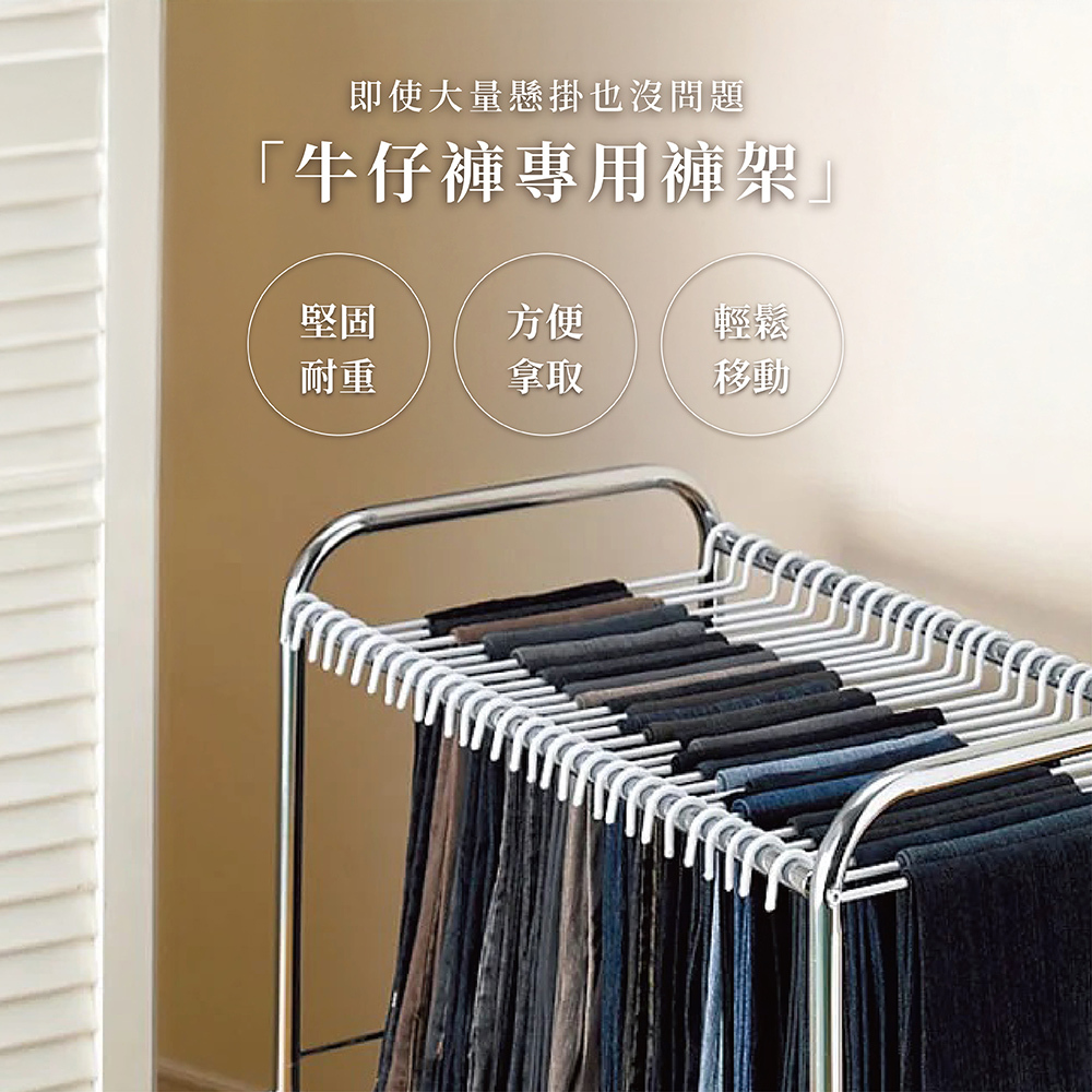 "輕鬆懸掛大量牛仔褲的堅固褲架,能有效利用壁櫥下層或衣櫥下方空間,收納褲子類衣物。附有防塵罩套,完美的防塵對策!堅固耐用結構!"