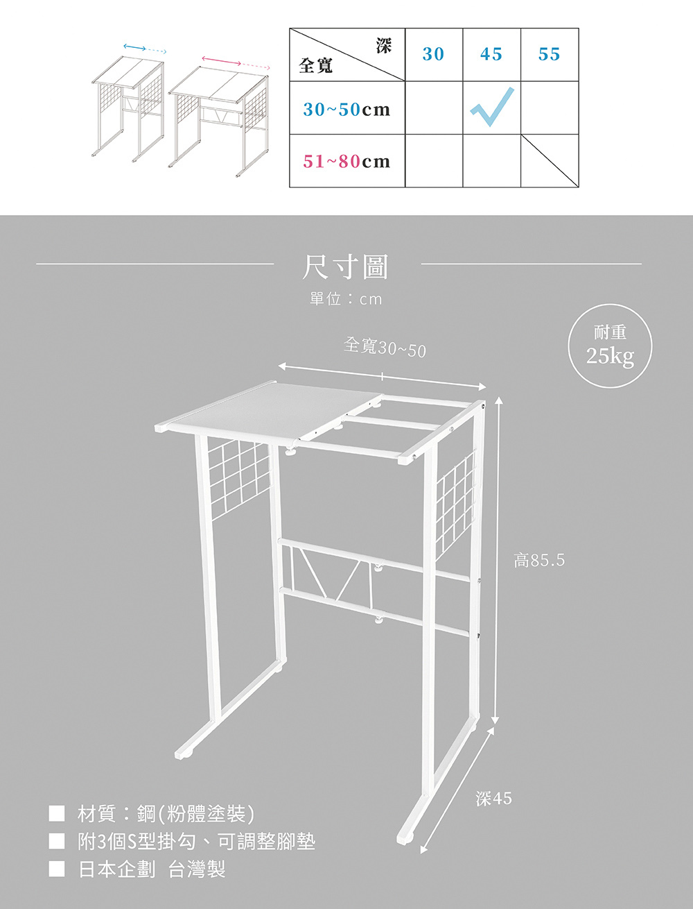 寬度可調節範圍為: 30~50cm